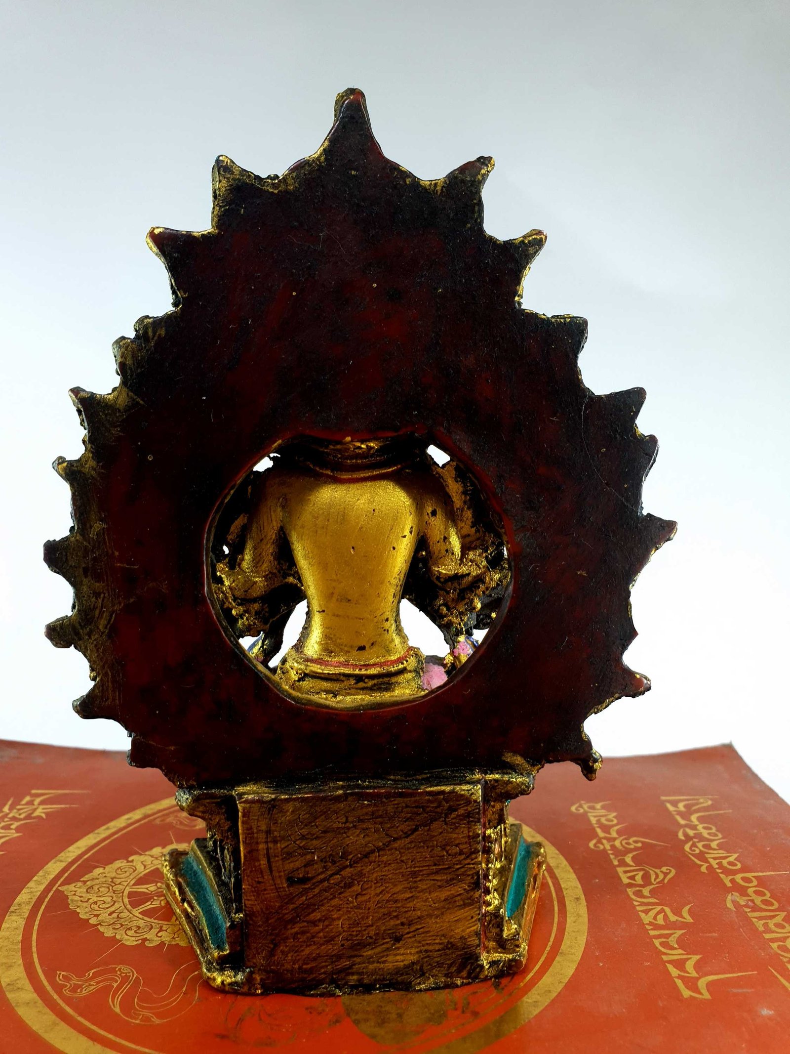 He holds both hands in front of his heart in a hand position signifying the turning the wheel of Buddhist teachings [Skt. dharmachakra mudra]. The left hand holds the stem of a blue lotus or 'night lotus'[Skt. Utpala]. The word utpala means to 'burst open'. This supports an auspicious golden wheel [Skt. Chakra] which represents change, universal cycles of existence such as the changing of the hands of a watch, the seasons of the year, the earth & moon revolving around the sun and these three in turn revolving with other planets. All is in flux, forever changing. Each forward Turning of the wheel represents a movement of Buddhist teaching. This is usually called the turning of the Wheel of Dharma. The eight spokes symbolising the noble Eightfold Path of right Thought [mirror], right Insight or View [mustard seed], right Thought, right Action [bilva fruit], right Effort [durva grass], right Livelihood [curds] and right Contemplation [vermilion powder].
