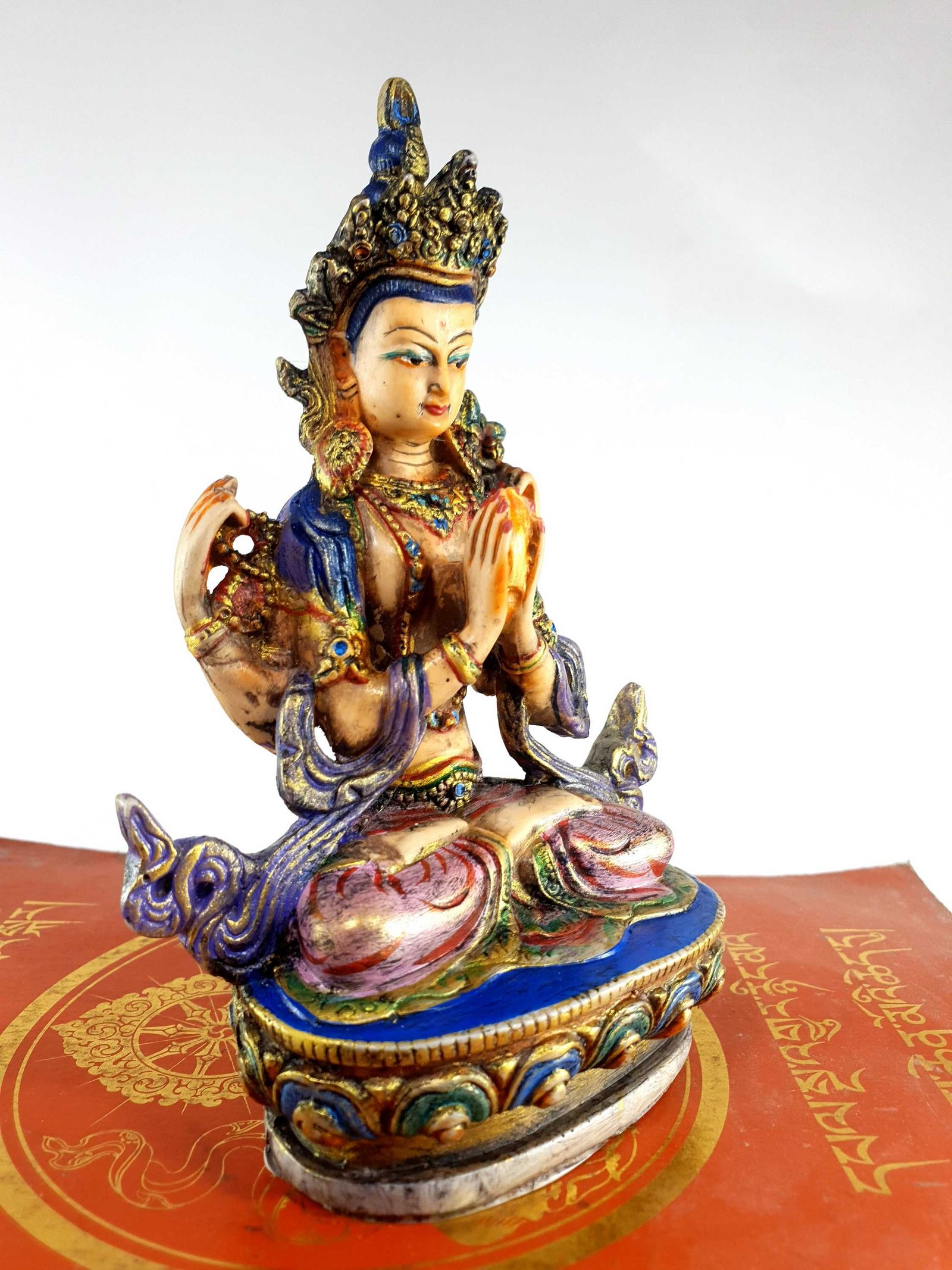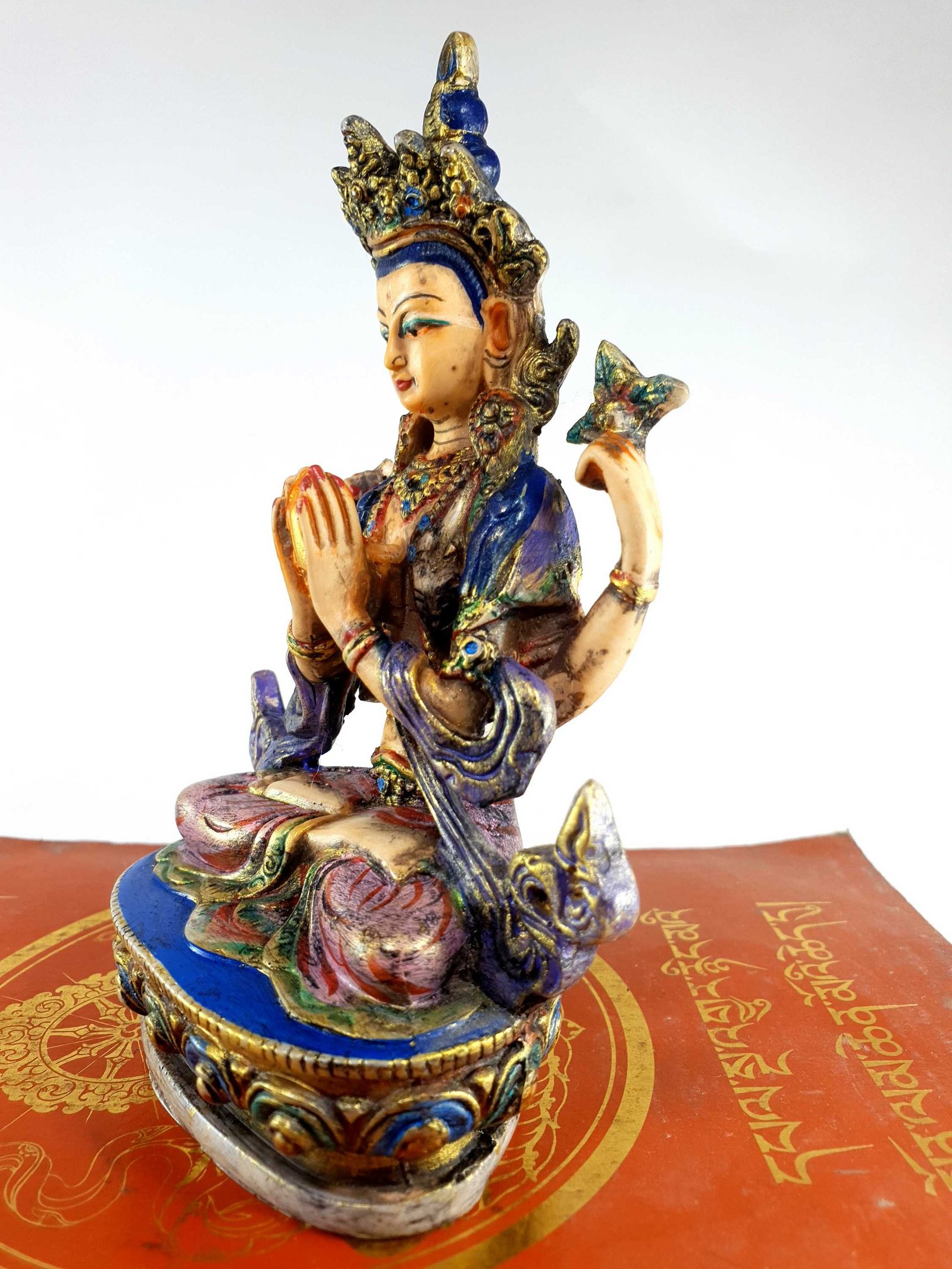 Resin Statue of Chenrezig Traditional Color Painted, White, Blue , Bodhisattva of Compassion, Protector of All Beings