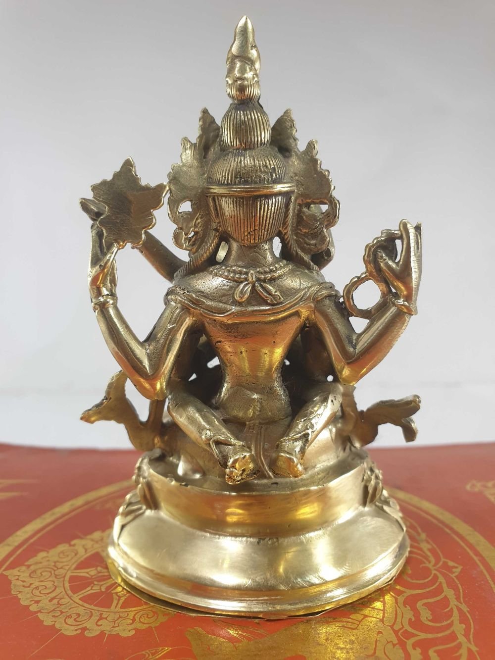 The first two, the inner arms, have palms joined at the heart, holding a sky-blue, and wish fulfilling jewel. This symbolizes that in whatever way Chenrezig manifests to benefit beings, the quality of Chenrezig's mind is never separate from the all-pervasive primal wisdom.