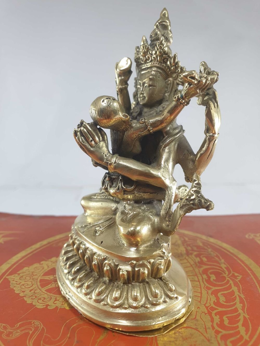 : IntroductionShakti Yab-yum is a common symbol in Nepalese and Tibetan art. It represents the primordial union of wisdom and compassion, depicted as a male deity in union with his female consort via the similar concept of interpenetration or "coalescence," as illustrated by the concept of Indra's net. The male figure represents compassion and dexterity, while the female figure represents insight. The female is seated on the male's lap in yab-yum. A rare rendition of a similar figure, but reversed, with the male sitting on the female's lap, is known as yum-yab. Read More