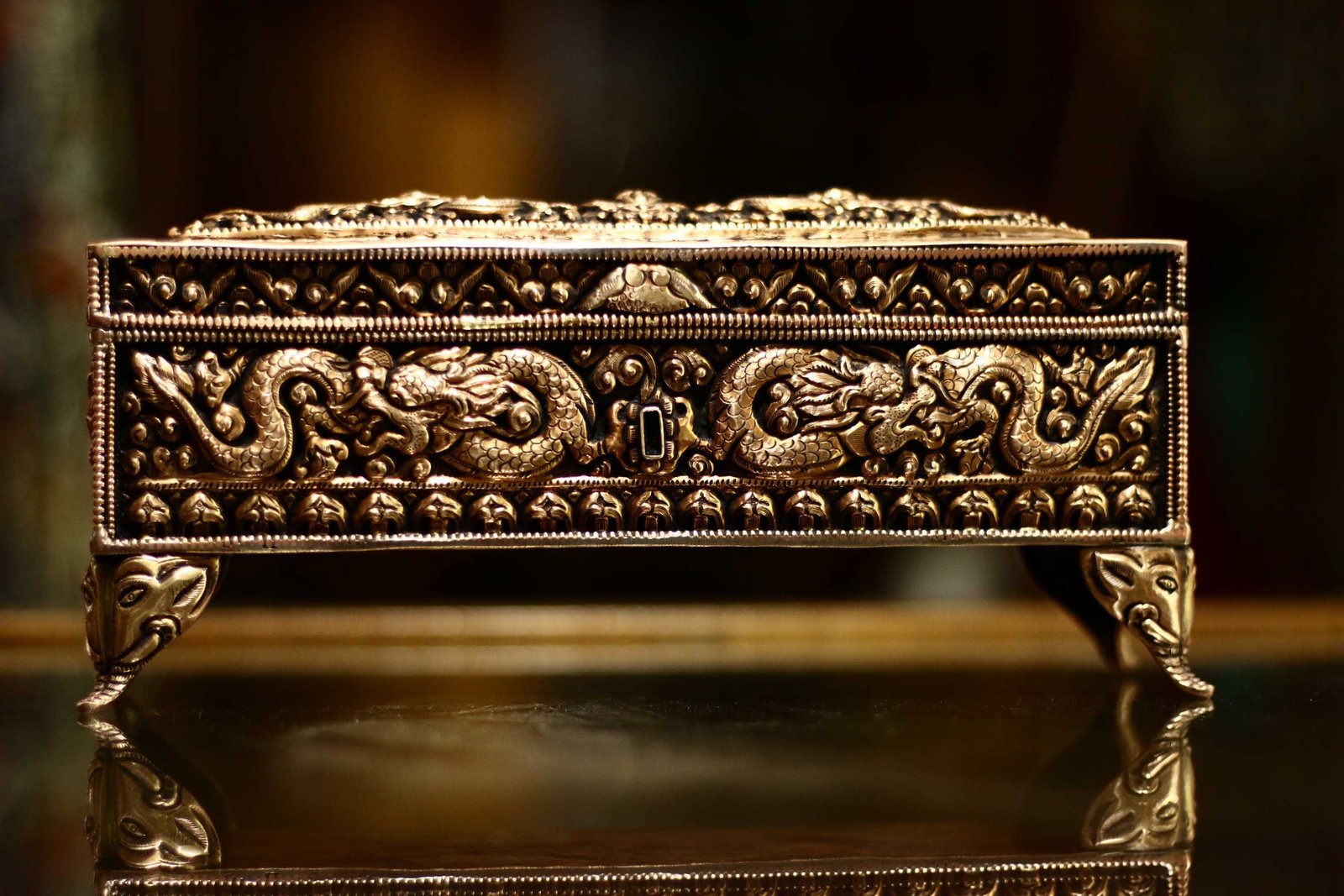 In Buddhist culture, metal jewelry boxes are often used to store sacred objects such as prayer beads, meditation cushions, or other items used in Buddhist practice. These boxes may be decorated with intricate designs that incorporate Buddhist symbols such as the dharma wheel, the vajra, or the Buddha's footprint.