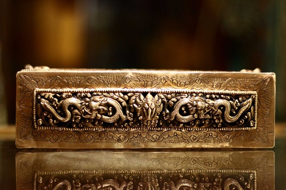 In Tibetan culture, metal jewelry boxes are often used to store important religious artifacts such as prayer flags, thangkas (religious paintings), or Tibetan singing bowls. These boxes may be decorated with traditional Tibetan designs such as the eight auspicious symbols or the Tibetan knot.
