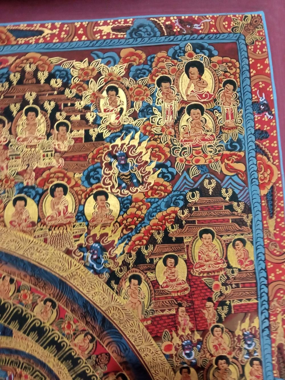 Mandala Thangka painting is a revered form of sacred art in Buddhism, characterized by intricate and vibrant depictions on cotton or silk. These paintings often feature a central deity or Buddha figure surrounded by meticulously crafted symmetrical patterns, geometric designs, and symbolic elements. Mandala Thangkas serve as visual aids for meditation and spiritual growth, guiding practitioners towards inner peace, harmony, and enlightenment. Through their precise brushwork and rich symbolism, these artworks invite viewers to contemplate the profound spiritual journey within themselves, fostering mindfulness, concentration, and a deeper connection with the universal truths of Buddhism. Read More