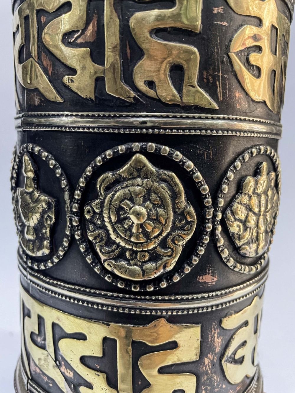 A prayer wheel is a cylindrical wheel on a spindle made from metal, wood, stone, leather, or coarse cotton. Traditionally, the mantra Om Mani Padme Hum is written in the Newari language of Nepal, on the outside of the wheel. Also sometimes depicted are Dakinis, Protectors, and very often the 8 auspicious symbols Ashtamangala. At the core of the cylinder is a "Life Tree" often made of wood or metal with certain mantras written on or wrapped around it. Many thousands (or in the case of larger prayer wheels, millions) of mantras are then wrapped around this life tree. The Mantra Om Mani Padme Hum is most commonly used, but other mantras may be used as well. According to the Tibetan Buddhist tradition based on the lineage texts regarding prayer wheels, spinning such a wheel will have much the same meritorious effect as orally reciting the prayers. Read More