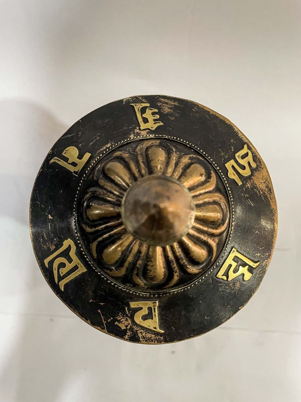Table Prayer Wheel Mantra Inside, Embossed Mantra , A wheel containing mantras, used to accumulate merit and spread blessings