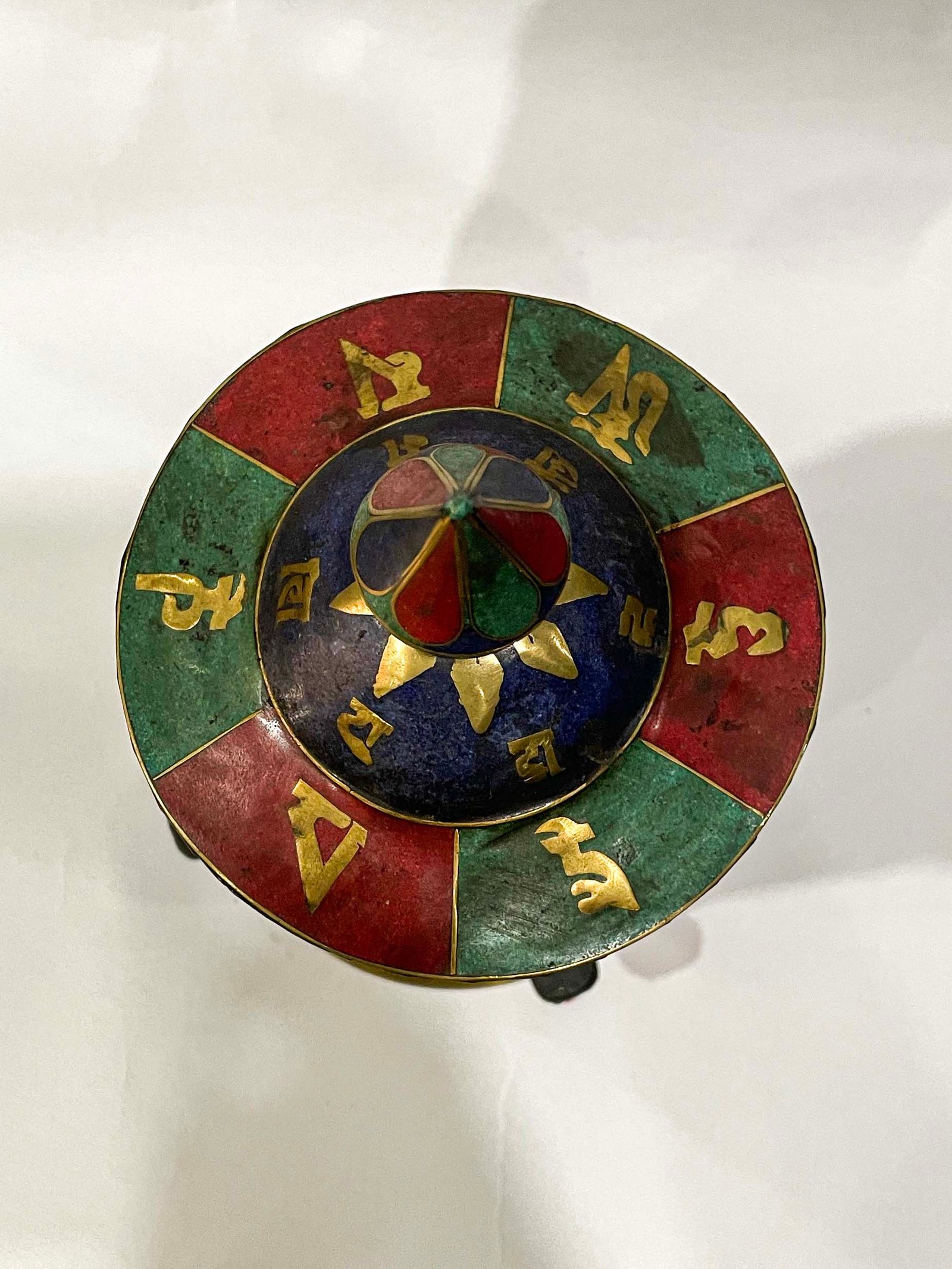 The Prayer Wheel is adorned with an exquisite array of semi-precious stones, including turquoise, coral, and lapis lazuli. These stones are carefully selected and meticulously placed on the Prayer Wheel's surface, adding a touch of opulence and enhancing its overall beauty. Each stone is thoughtfully positioned using a high-quality adhesive, ensuring secure and long-lasting attachment. The vibrant colors and unique patterns of the stones create a captivating contrast against the backdrop of the Prayer Wheel, elevating its visual appeal and making it truly eye-catching. Read More