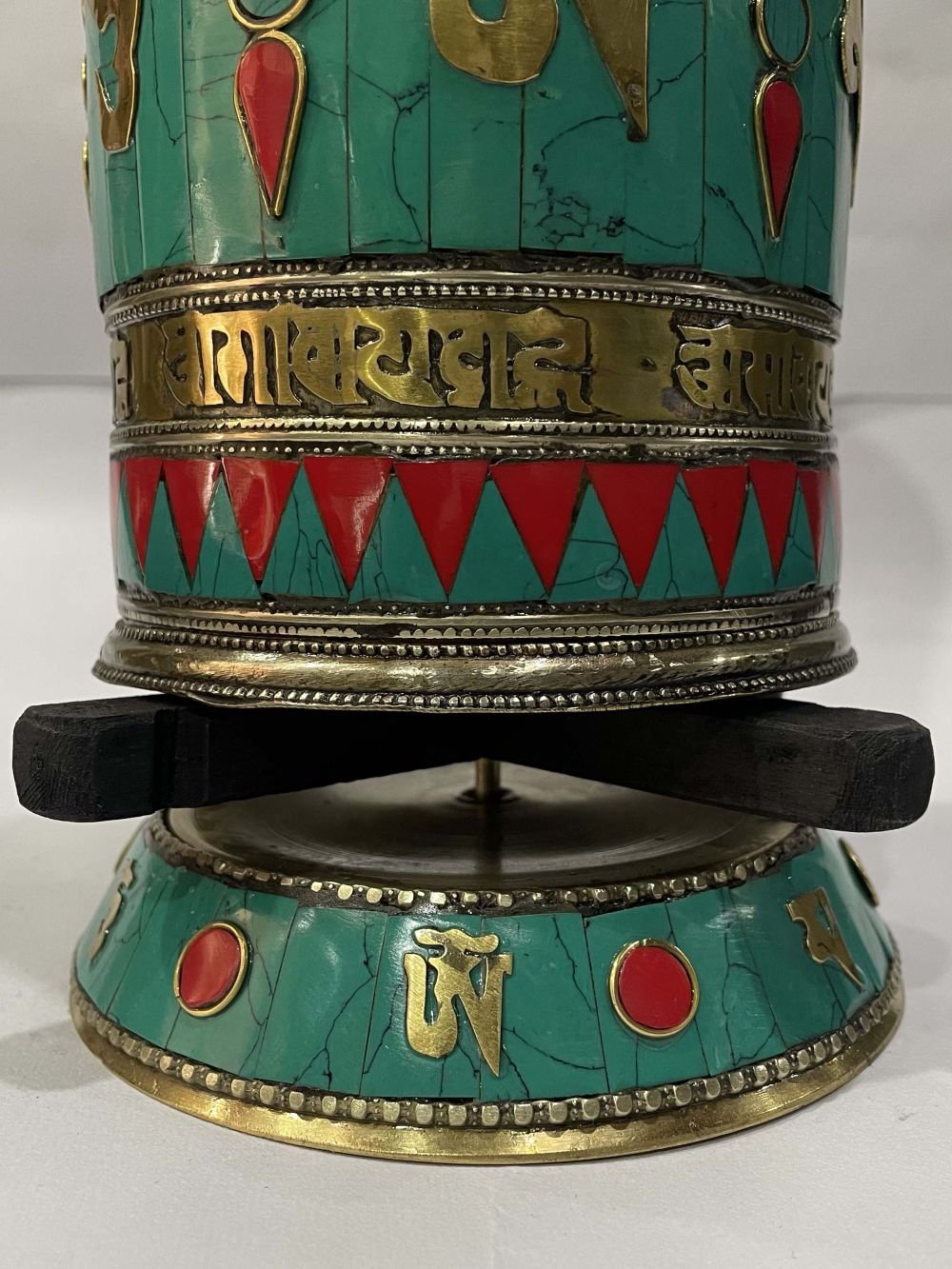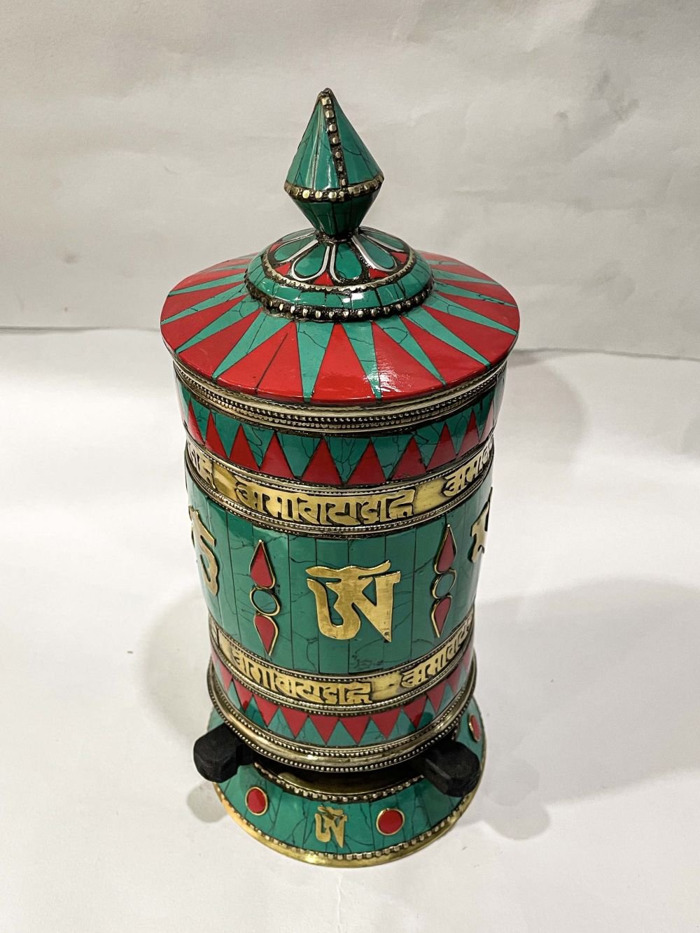 Table Prayer Wheel with Mantra, Stone Setting , A wheel containing mantras, used to accumulate merit and spread blessings