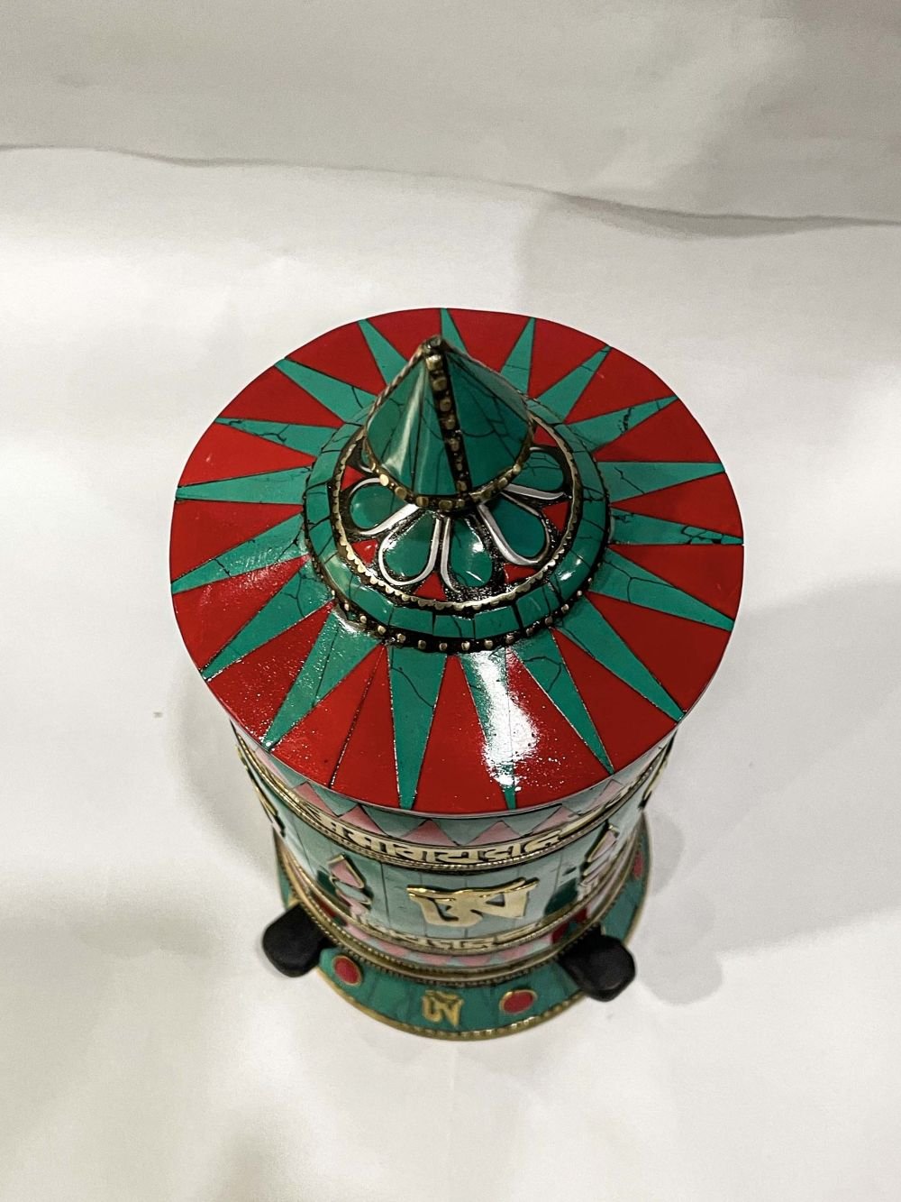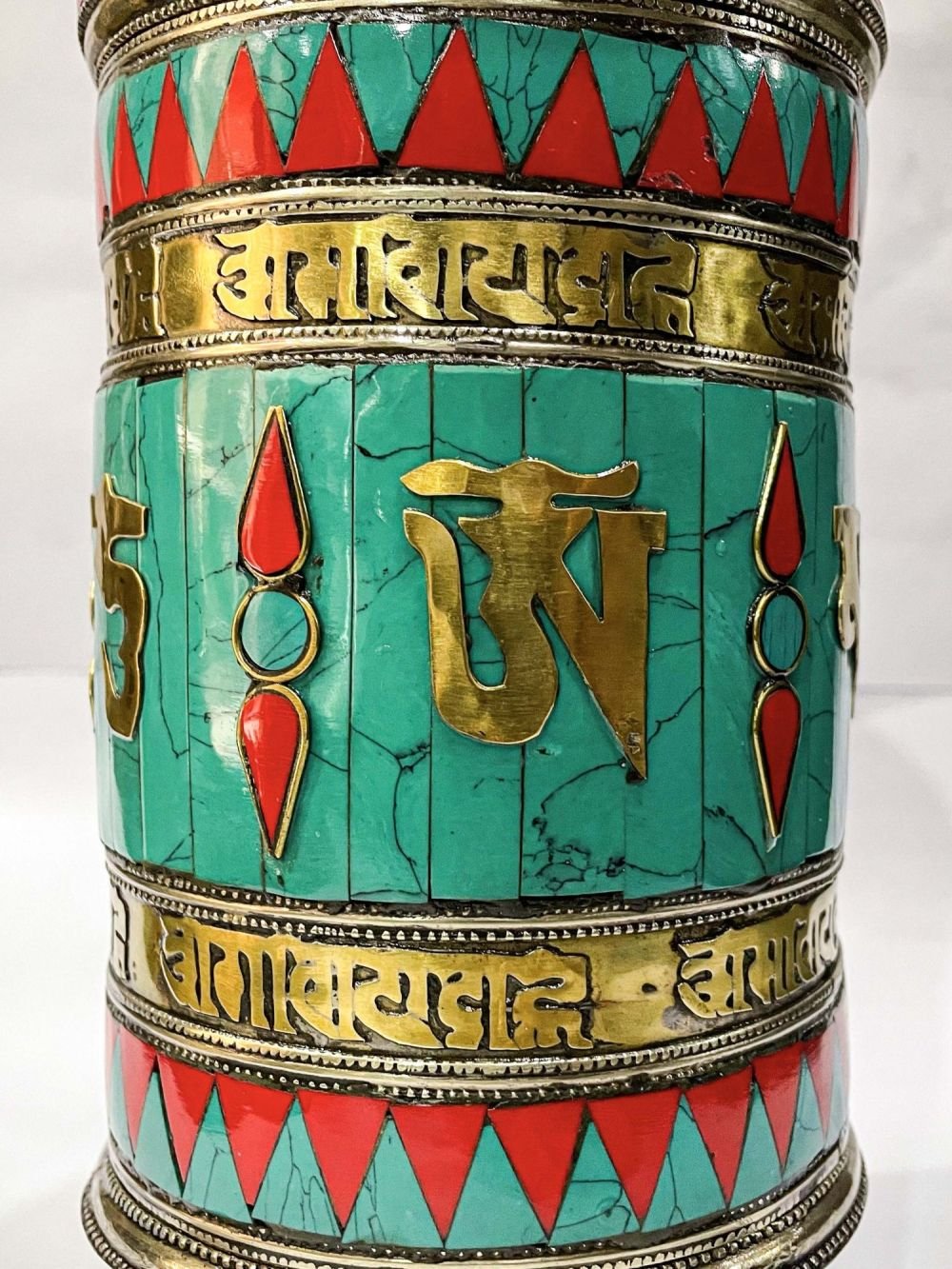 The Prayer Wheel is adorned with an exquisite array of semi-precious stones, including turquoise, coral, and lapis lazuli. These stones are carefully selected and meticulously placed on the Prayer Wheel's surface, adding a touch of opulence and enhancing its overall beauty. Each stone is thoughtfully positioned using a high-quality adhesive, ensuring secure and long-lasting attachment. The vibrant colors and unique patterns of the stones create a captivating contrast against the backdrop of the Prayer Wheel, elevating its visual appeal and making it truly eye-catching. Read More