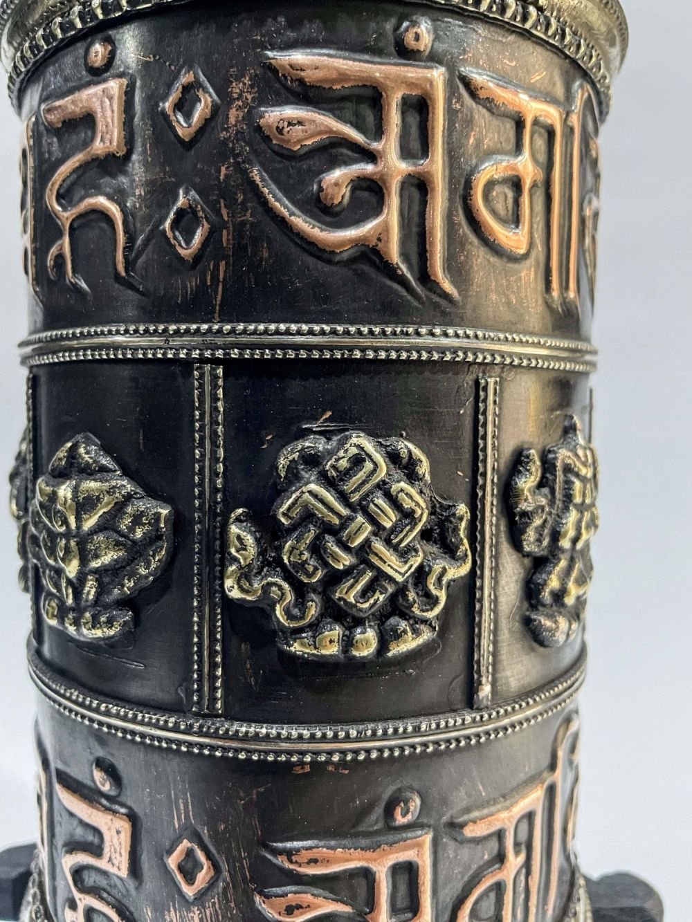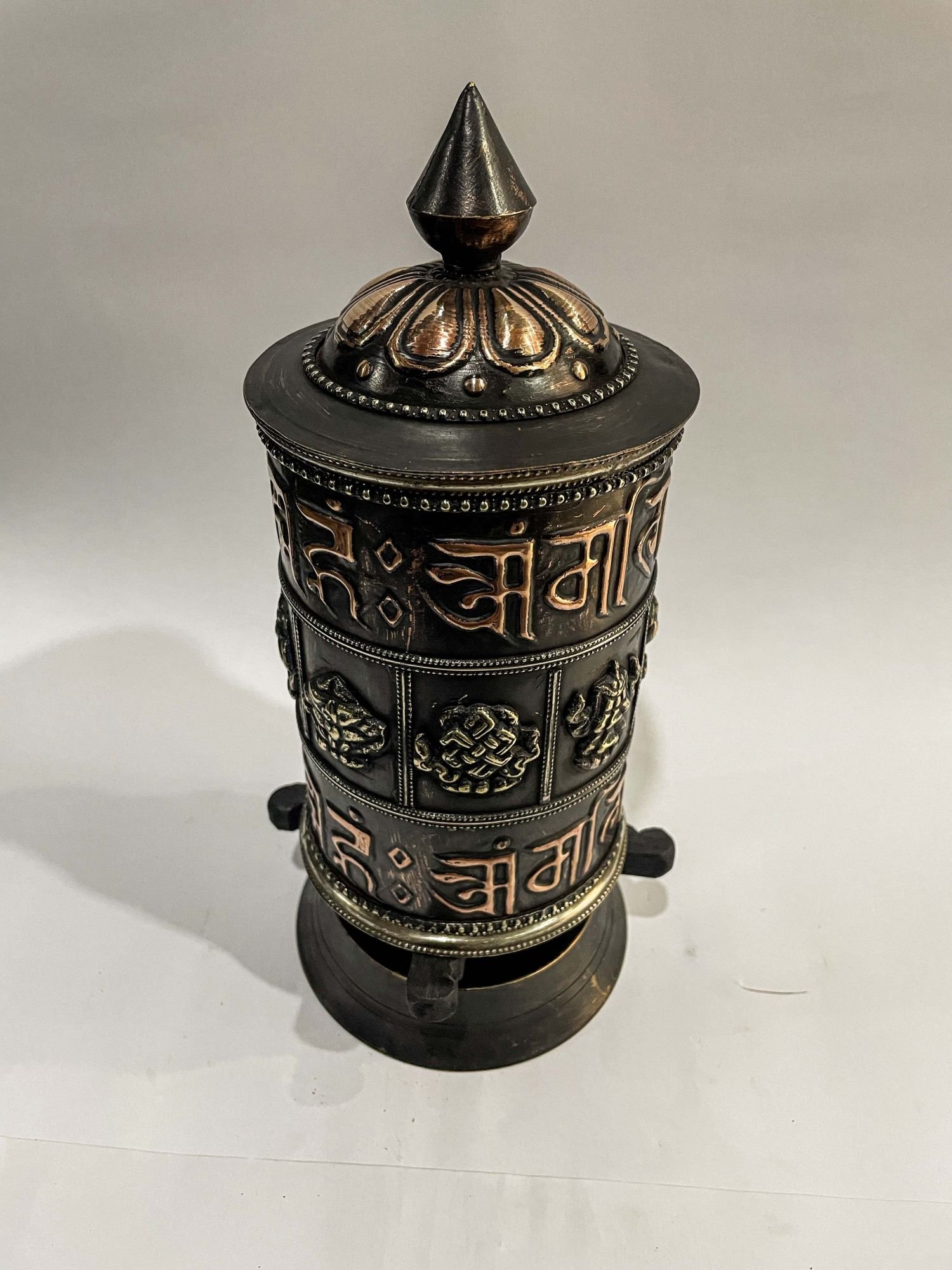 Table Prayer Wheel Big Size with Mantra Inside, Oxidized with Carved Mantra , A wheel containing mantras, used to accumulate merit and spread blessings