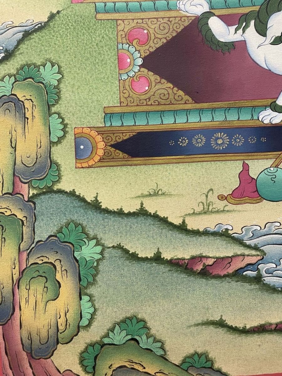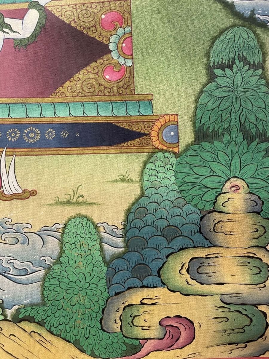A thangka, also known as tangka, thanka, or tanka, is a vibrant and intricate Tibetan Buddhist painting that serves as a visual representation of spiritual teachings. Crafted with meticulous detail on cotton or silk appliqué, thangkas depict a wide range of subjects including Buddhist deities, sacred scenes, mandalas, and narrative stories. These sacred artworks are traditionally kept unframed and rolled up for storage, resembling ancient scrolls. To protect their delicate nature, thangkas are mounted on textile backings and often adorned with a silk cover on the front. Proper preservation in dry environments is crucial to maintain the integrity and longevity of the silk. Read More
