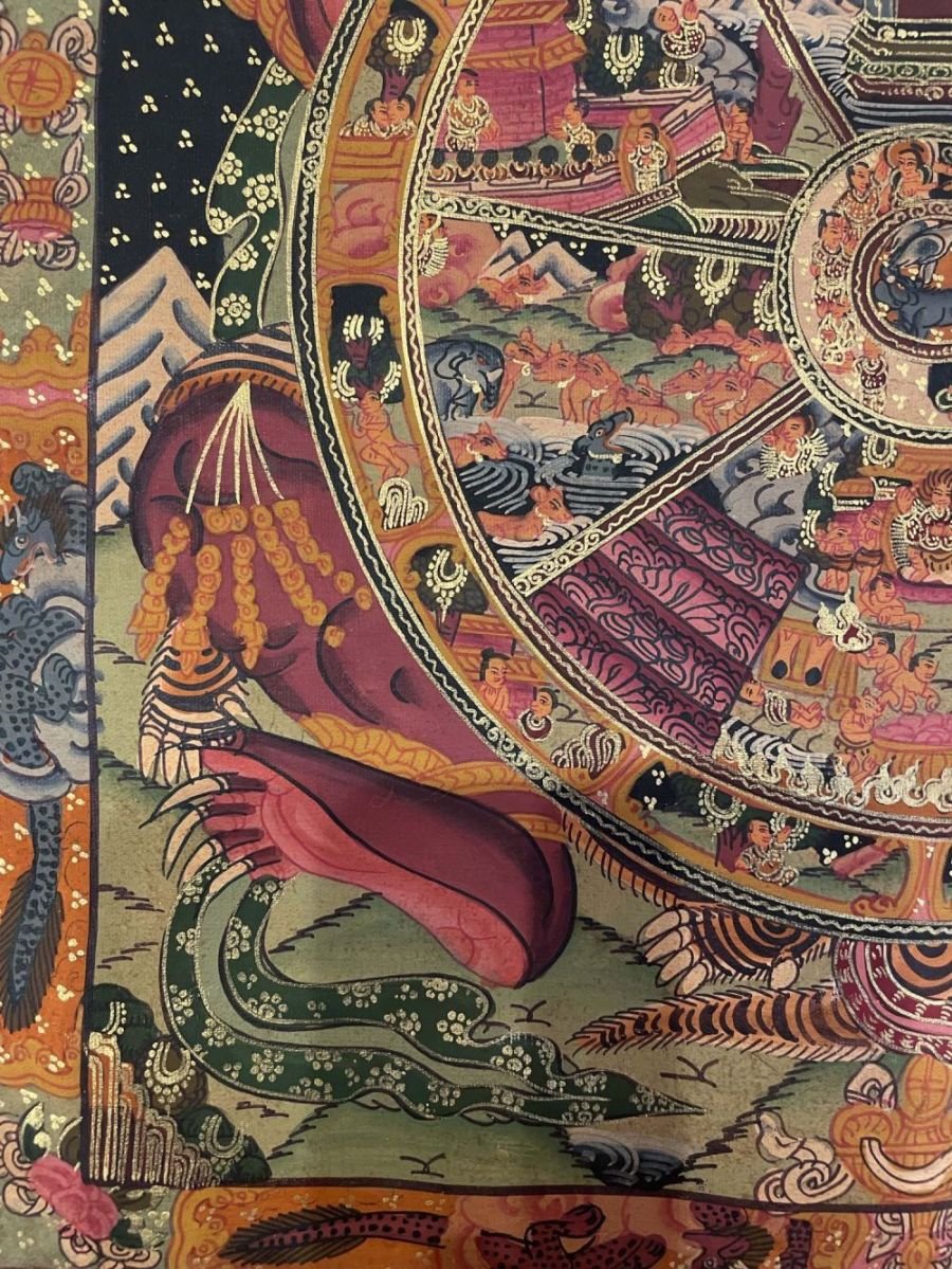 The fierce being holding the wheel symbolizes impermanence, which is why the being is a wrathful monster, though there is no need for it to be drawn with ornaments and so forth... Once I had such a painting drawn with a skeleton rather than a monster, in order to symbolize impermanence more clearly.