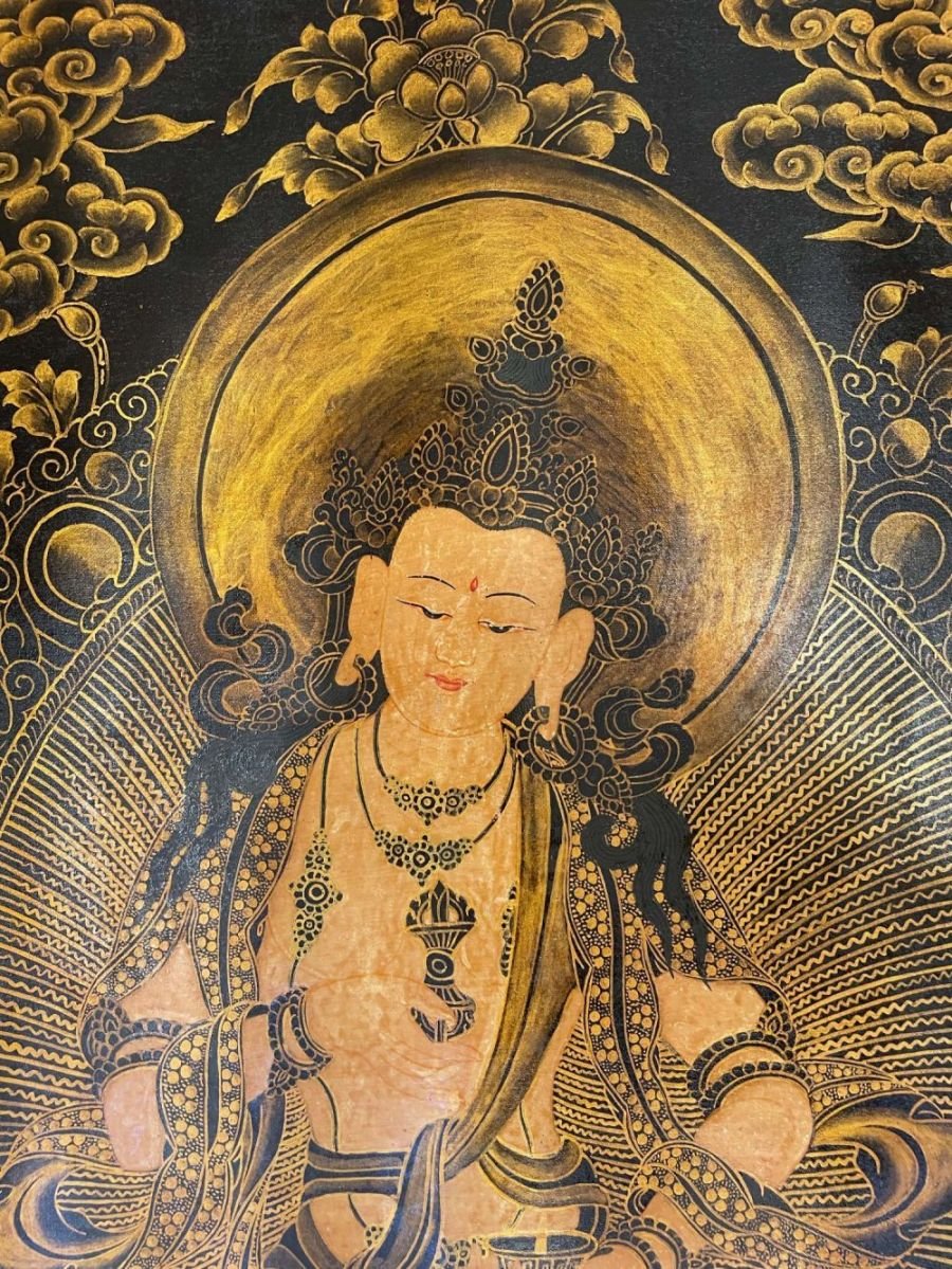 He is depicted as a young man in the prime of life, with all the silks and jewels of a wealthy prince. In his right hand he delicately balances a vajra at his heart. In his left had he holds a bell at his waist. The vajra represents Reality, and Compassion; while the bell represents Wisdom.