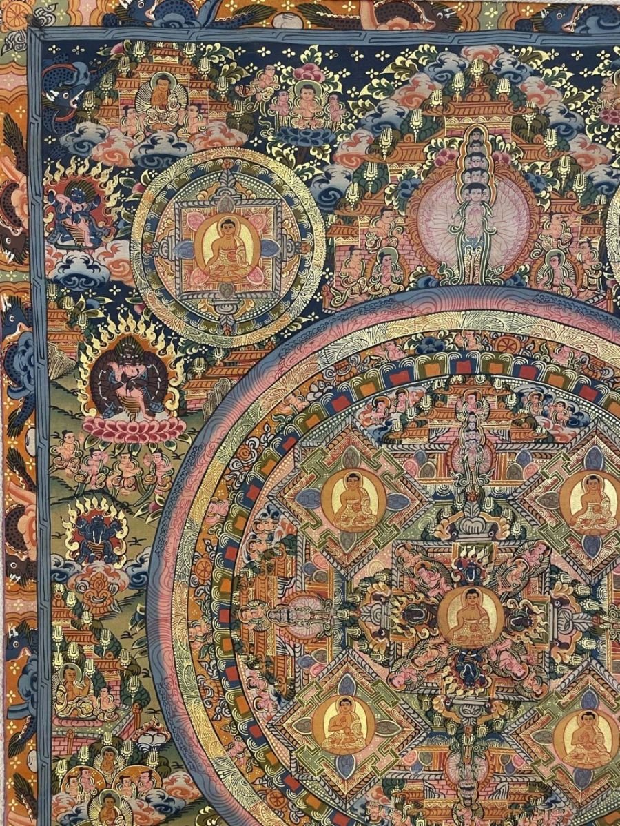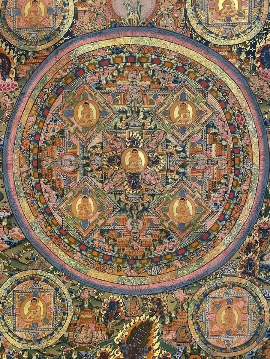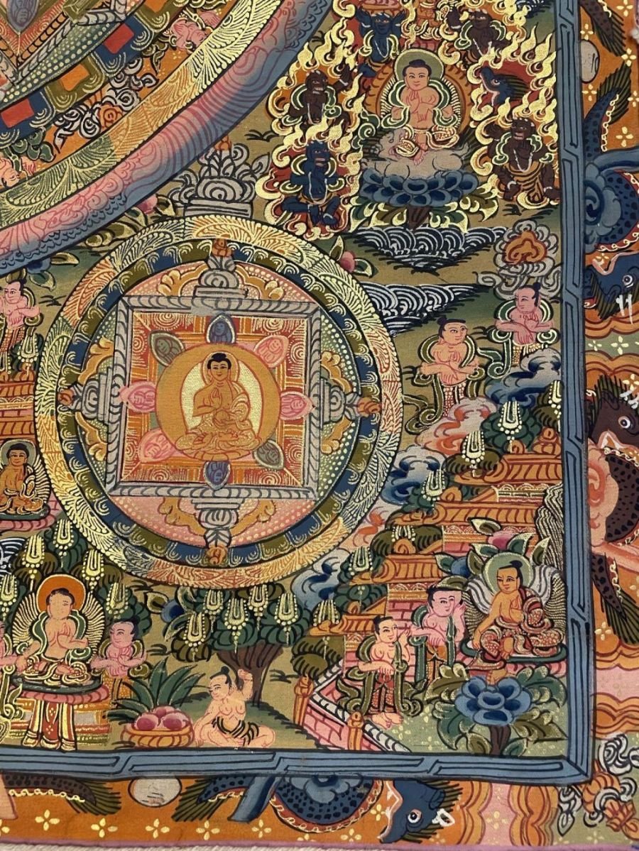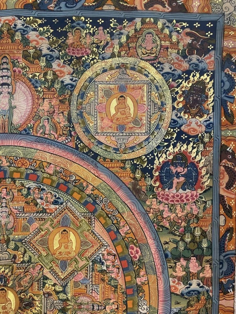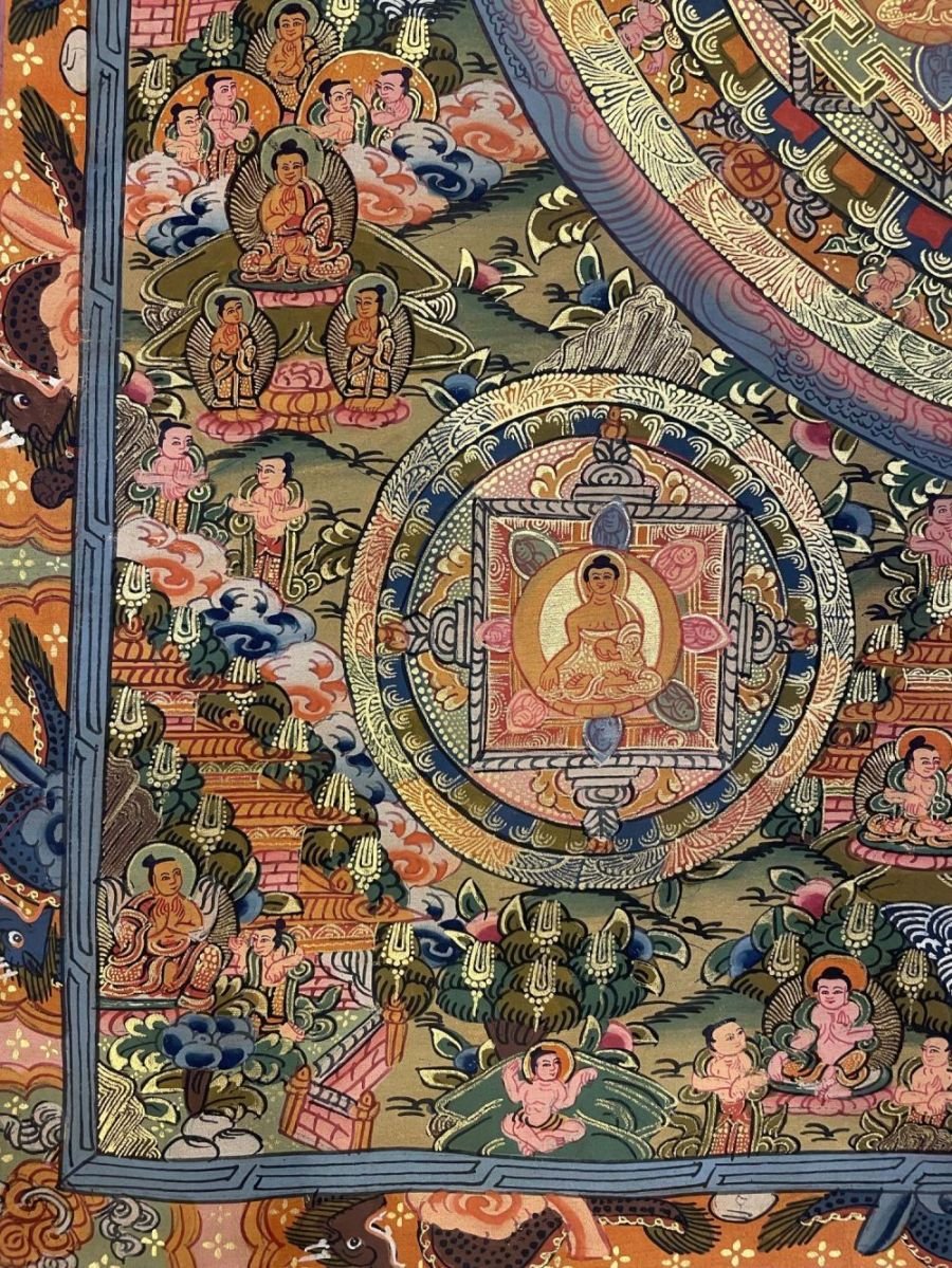 Mandala Thangka painting is a revered form of sacred art in Buddhism, characterized by intricate and vibrant depictions on cotton or silk. These paintings often feature a central deity or Buddha figure surrounded by meticulously crafted symmetrical patterns, geometric designs, and symbolic elements. Mandala Thangkas serve as visual aids for meditation and spiritual growth, guiding practitioners towards inner peace, harmony, and enlightenment. Through their precise brushwork and rich symbolism, these artworks invite viewers to contemplate the profound spiritual journey within themselves, fostering mindfulness, concentration, and a deeper connection with the universal truths of Buddhism. Read More
