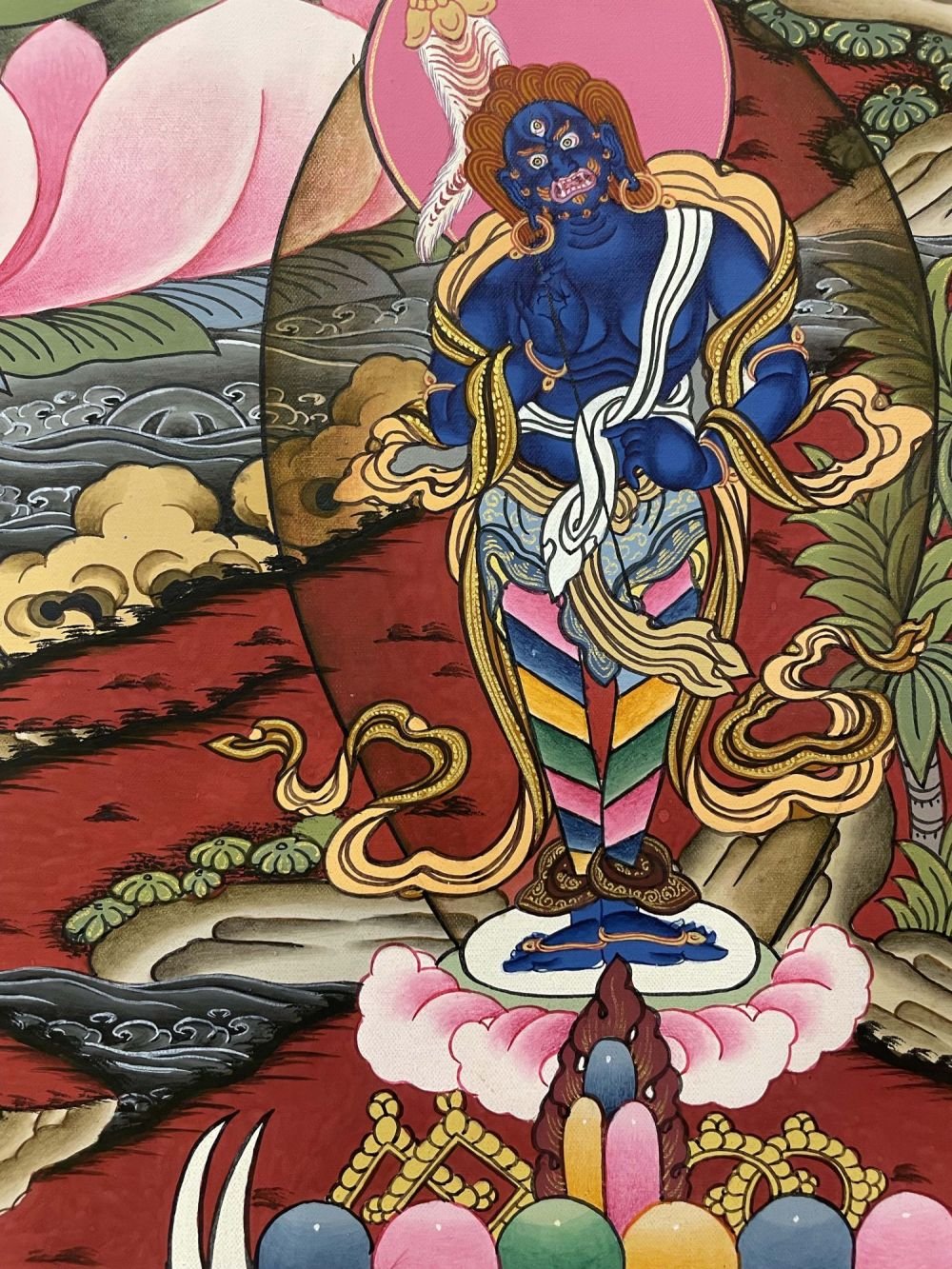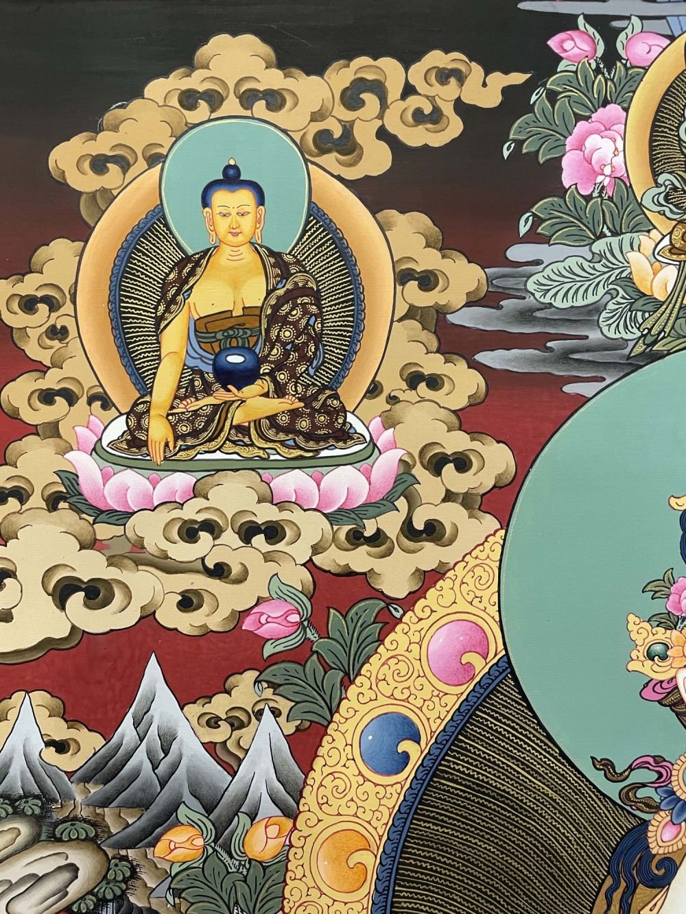A thangka, also known as tangka, thanka, or tanka, is a vibrant and intricate Tibetan Buddhist painting that serves as a visual representation of spiritual teachings. Crafted with meticulous detail on cotton or silk appliqué, thangkas depict a wide range of subjects including Buddhist deities, sacred scenes, mandalas, and narrative stories. These sacred artworks are traditionally kept unframed and rolled up for storage, resembling ancient scrolls. To protect their delicate nature, thangkas are mounted on textile backings and often adorned with a silk cover on the front. Proper preservation in dry environments is crucial to maintain the integrity and longevity of the silk. Read More