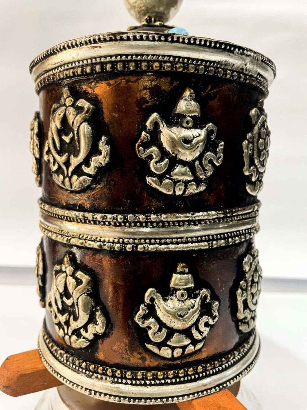 Table Prayer Wheel Big Size with Mantra Inside, Oxidized with Stone Setting, and Ashtamangala , A wheel containing mantras, used to accumulate merit and spread blessings