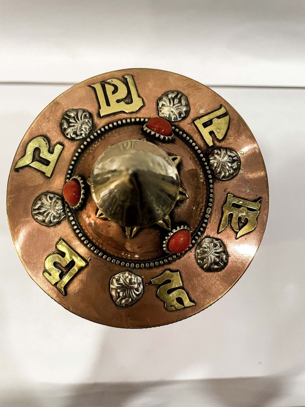 The Prayer Wheel is adorned with an exquisite array of semi-precious stones, including turquoise, coral, and lapis lazuli. These stones are carefully selected and meticulously placed on the Prayer Wheel's surface, adding a touch of opulence and enhancing its overall beauty. Each stone is thoughtfully positioned using a high-quality adhesive, ensuring secure and long-lasting attachment. The vibrant colors and unique patterns of the stones create a captivating contrast against the backdrop of the Prayer Wheel, elevating its visual appeal and making it truly eye-catching. Read More