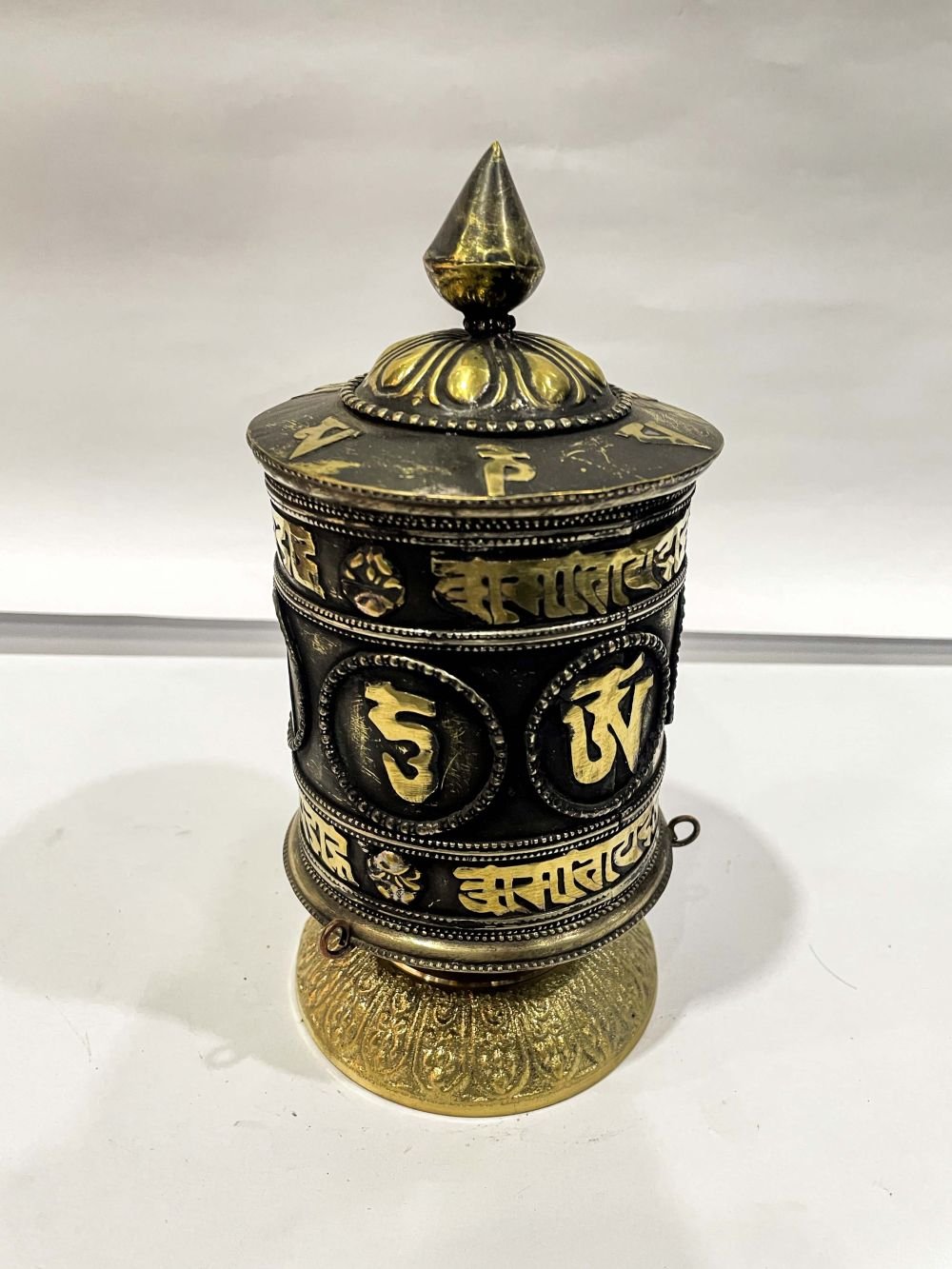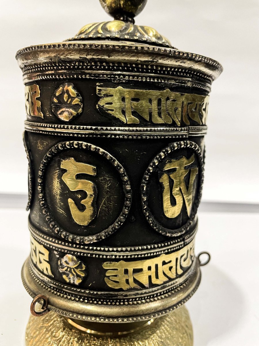 Table Prayer Wheel Big Size with Mantra Inside, Oxidized with Carved Mantra , A wheel containing mantras, used to accumulate merit and spread blessings