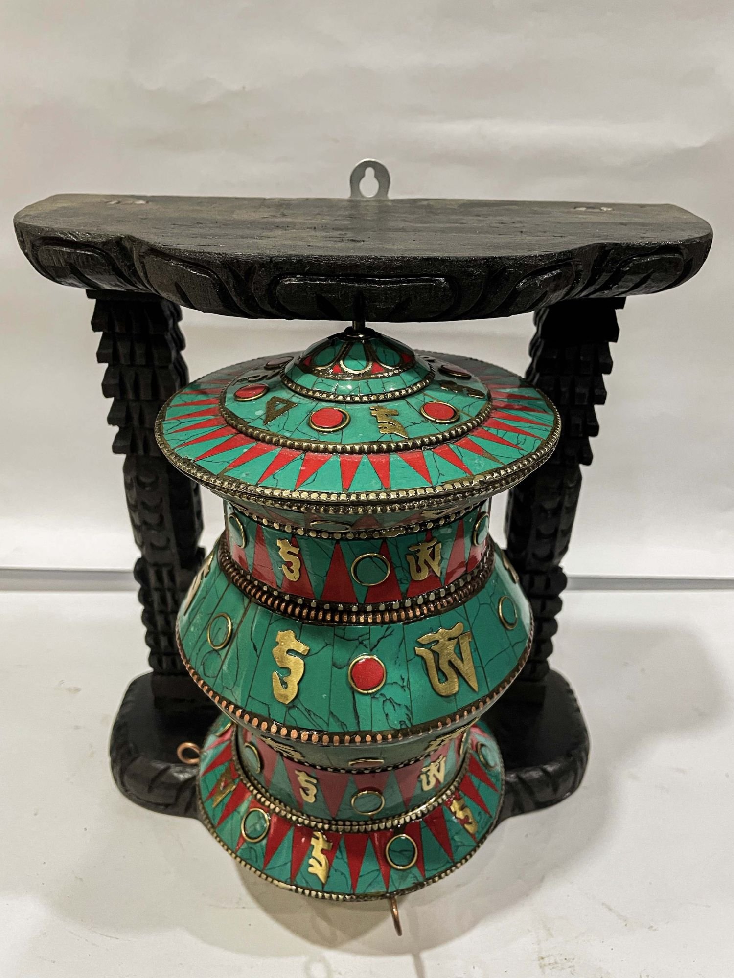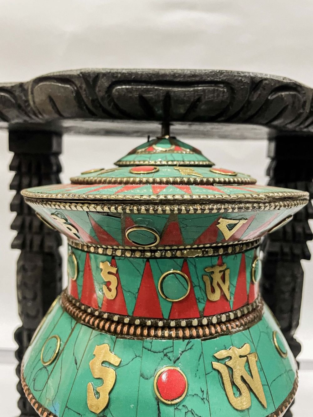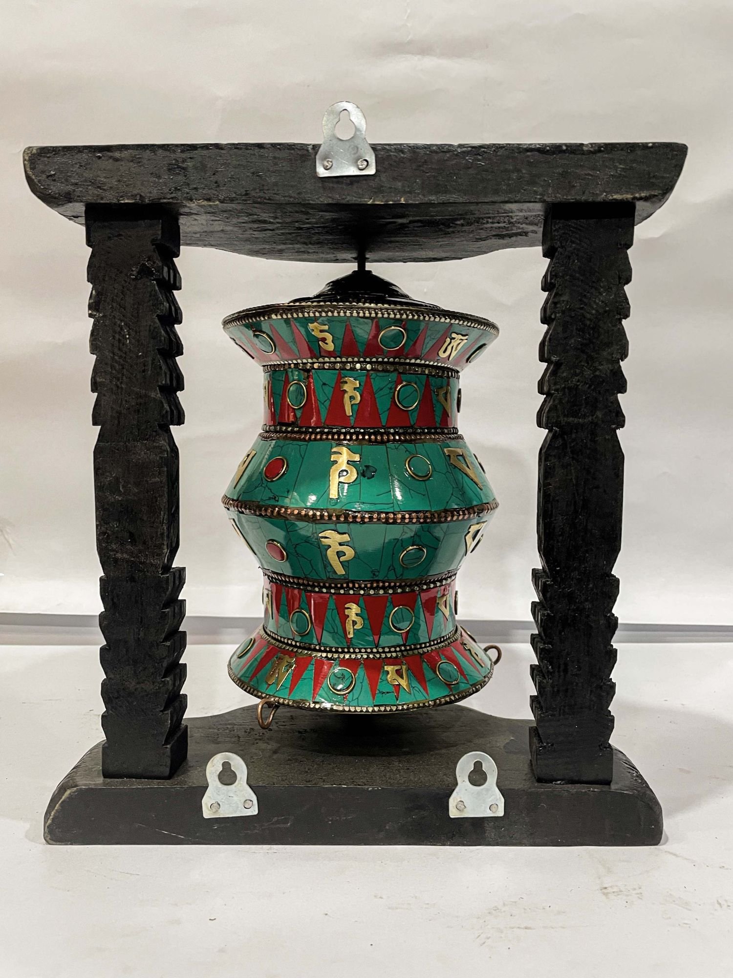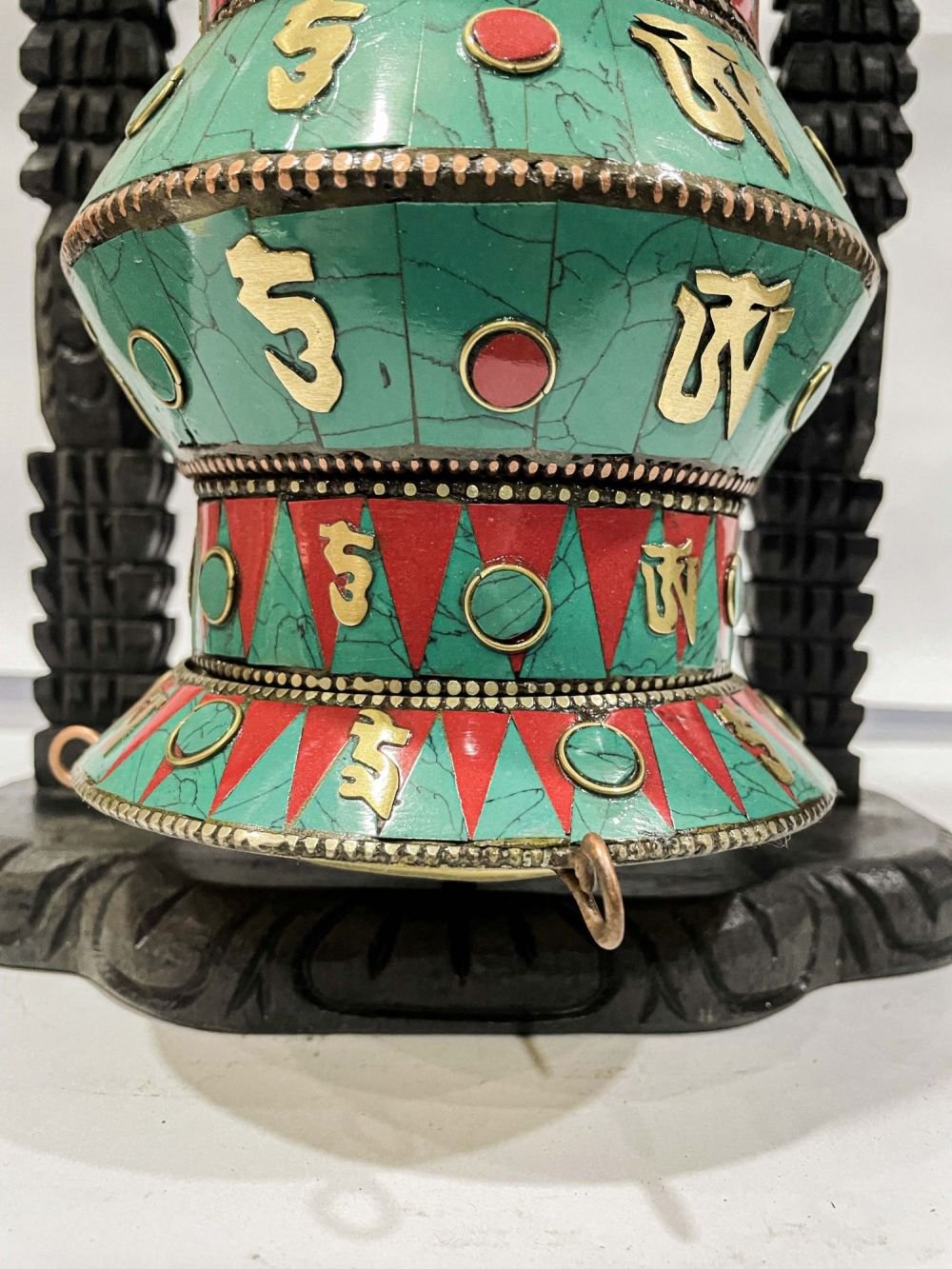 The Prayer Wheel is adorned with an exquisite array of semi-precious stones, including turquoise, coral, and lapis lazuli. These stones are carefully selected and meticulously placed on the Prayer Wheel's surface, adding a touch of opulence and enhancing its overall beauty. Each stone is thoughtfully positioned using a high-quality adhesive, ensuring secure and long-lasting attachment. The vibrant colors and unique patterns of the stones create a captivating contrast against the backdrop of the Prayer Wheel, elevating its visual appeal and making it truly eye-catching. Read More