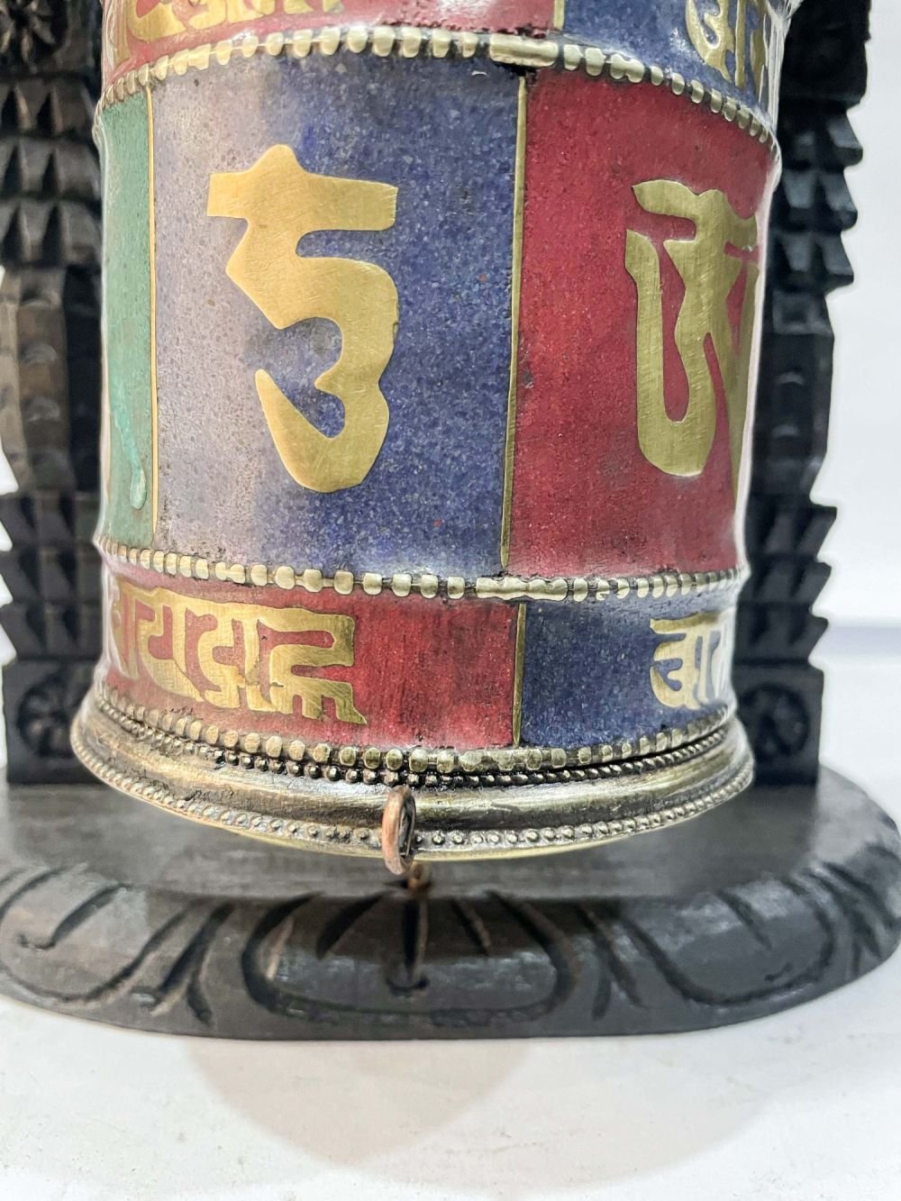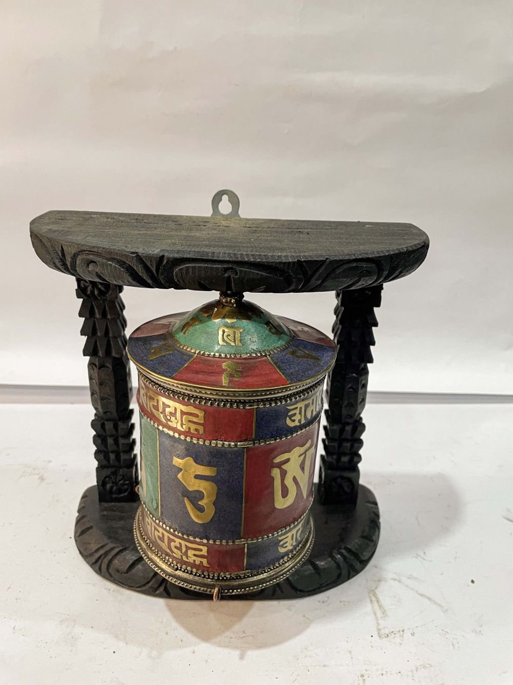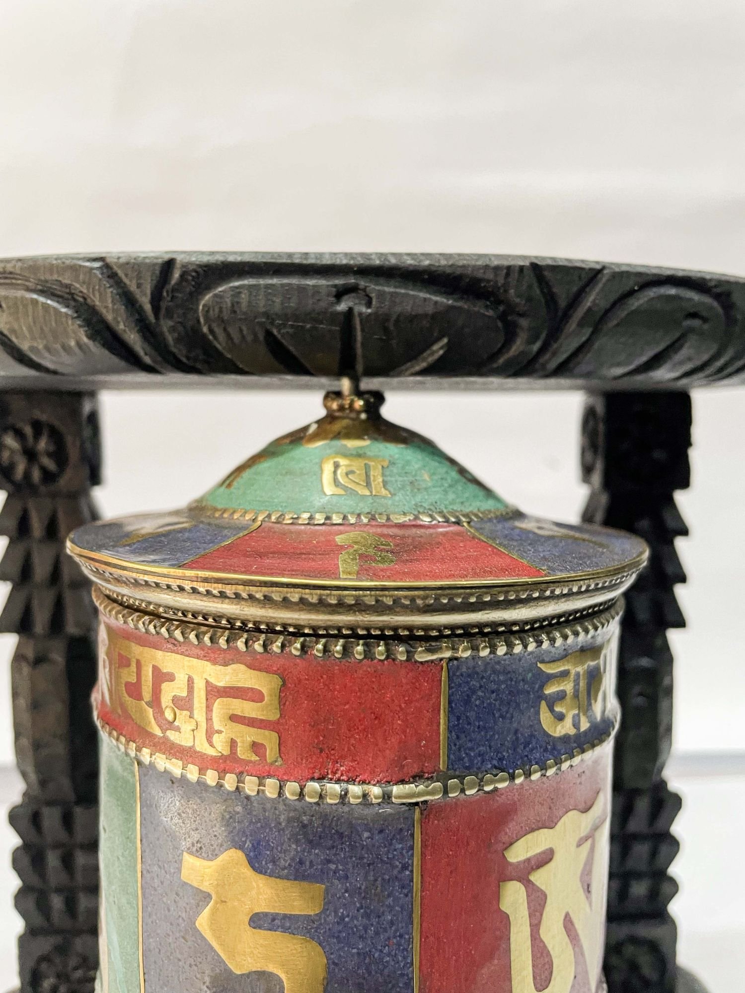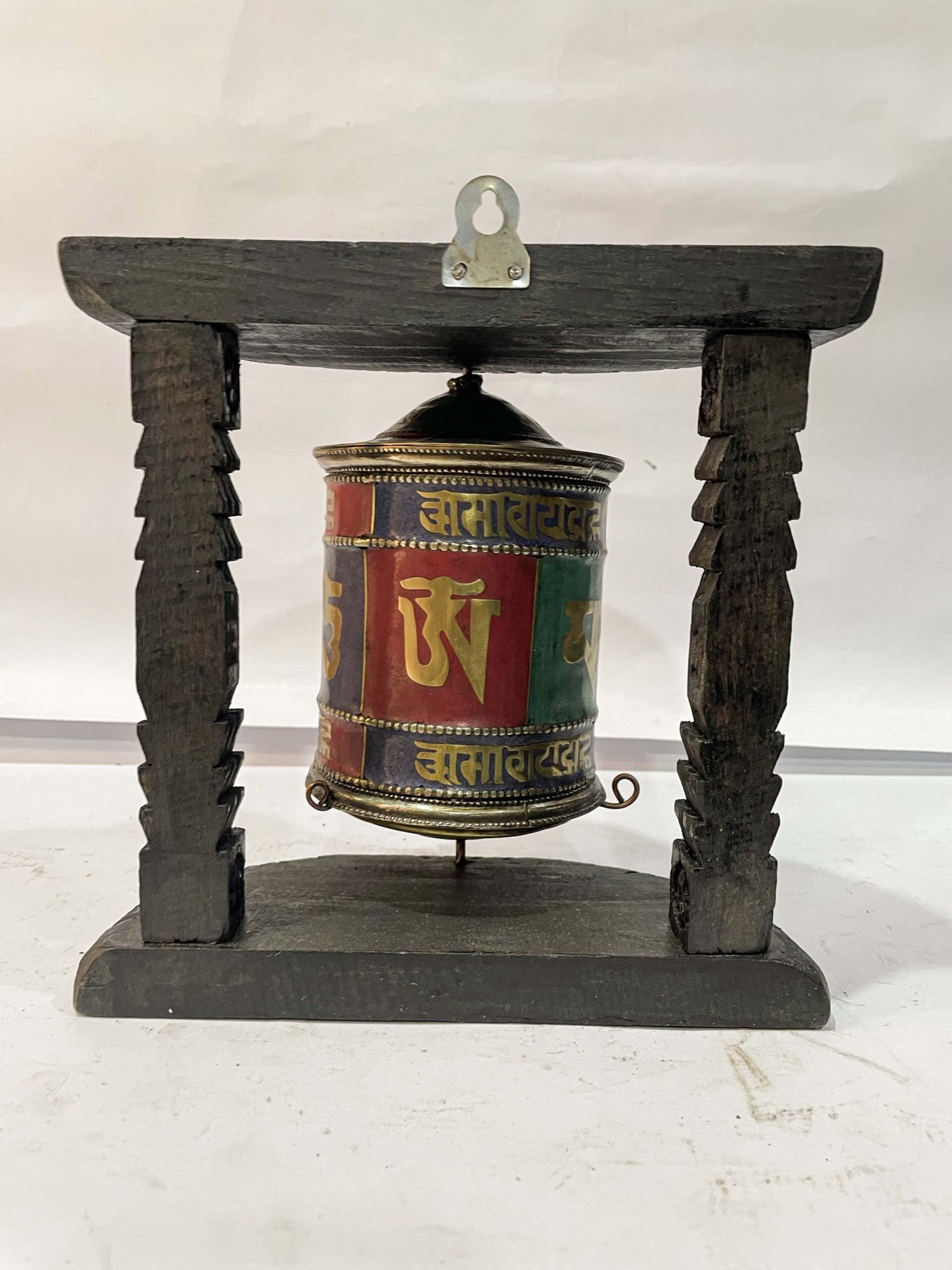 Wall Prayer Wheel with Mantra Inside, with Carved Mantra , A wheel containing mantras, used to accumulate merit and spread blessings