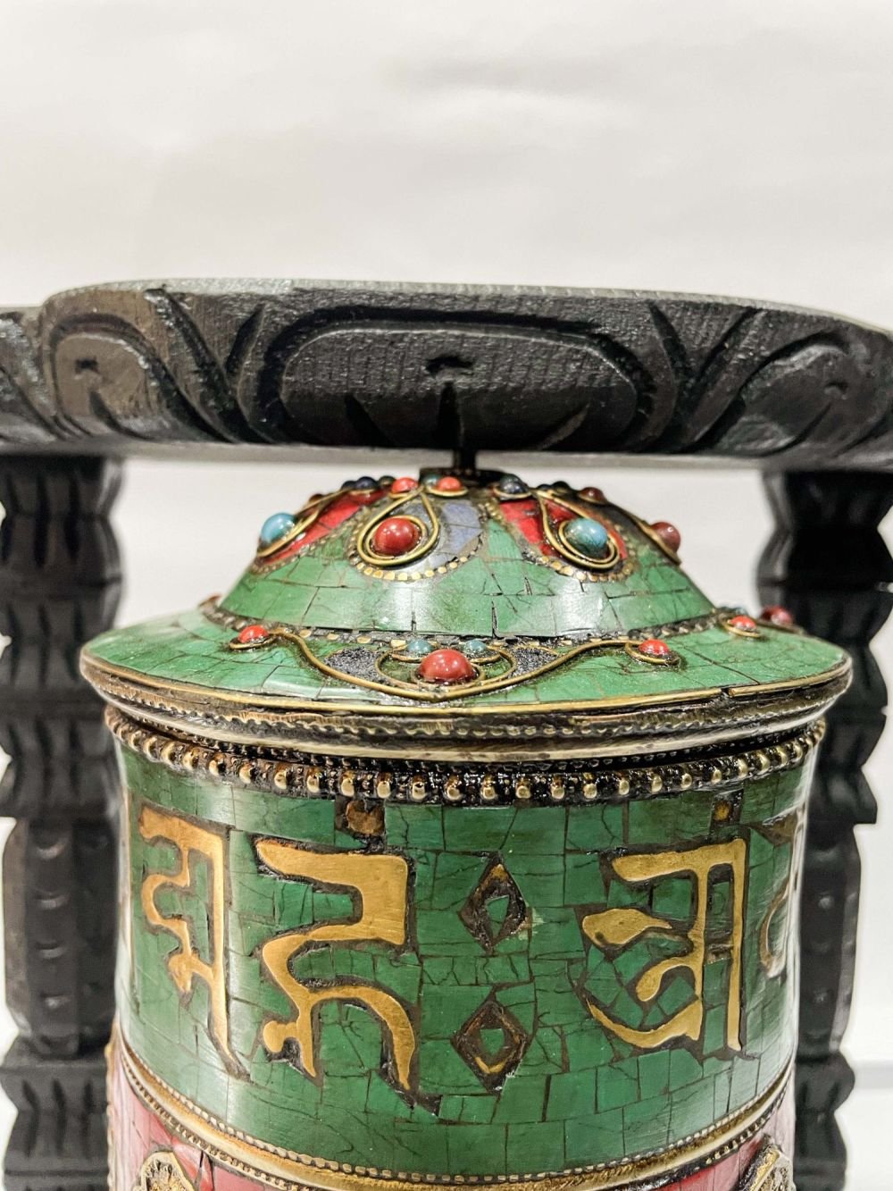 The Prayer Wheel is adorned with an exquisite array of semi-precious stones, including turquoise, coral, and lapis lazuli. These stones are carefully selected and meticulously placed on the Prayer Wheel's surface, adding a touch of opulence and enhancing its overall beauty. Each stone is thoughtfully positioned using a high-quality adhesive, ensuring secure and long-lasting attachment. The vibrant colors and unique patterns of the stones create a captivating contrast against the backdrop of the Prayer Wheel, elevating its visual appeal and making it truly eye-catching. Read More