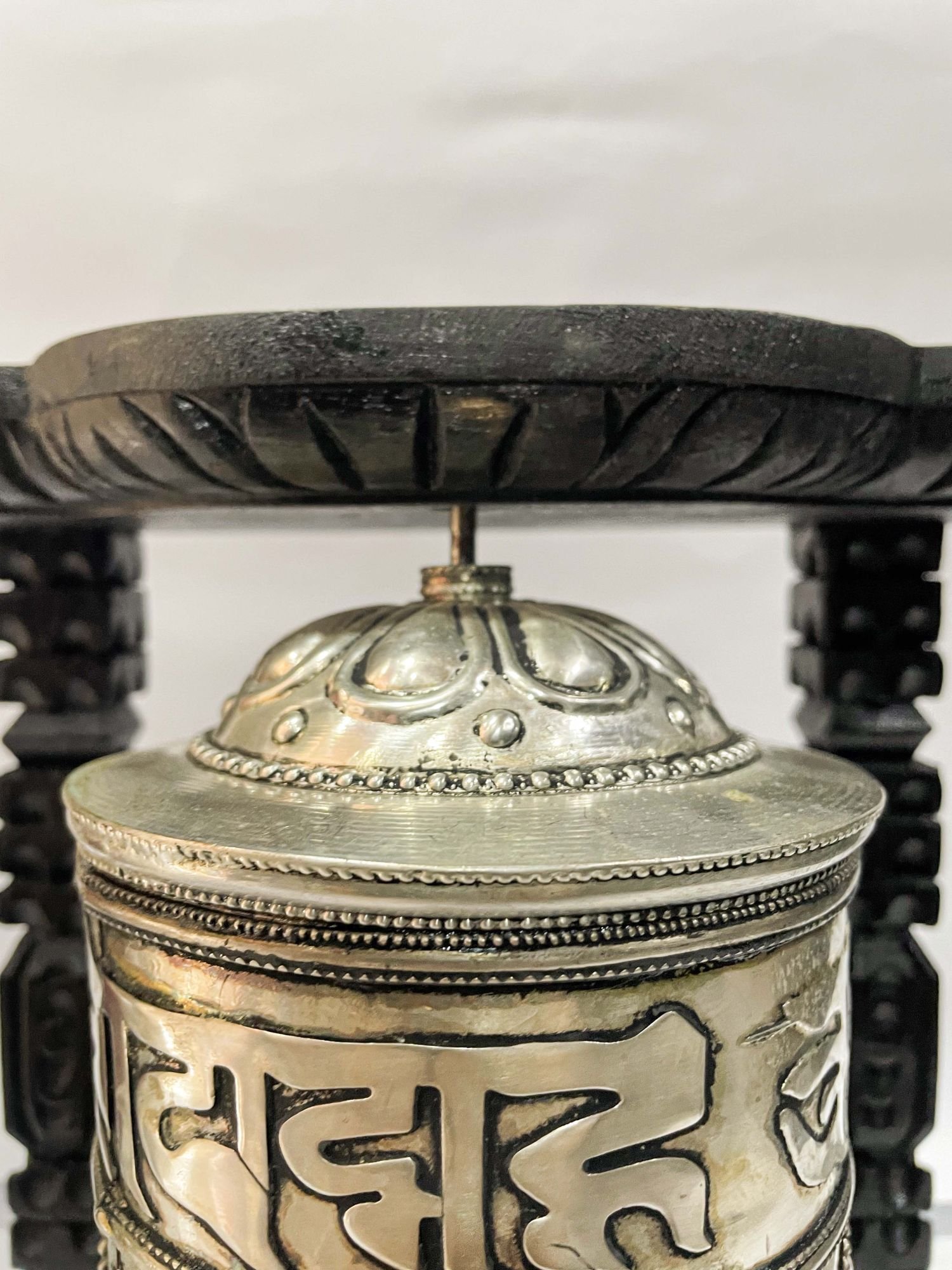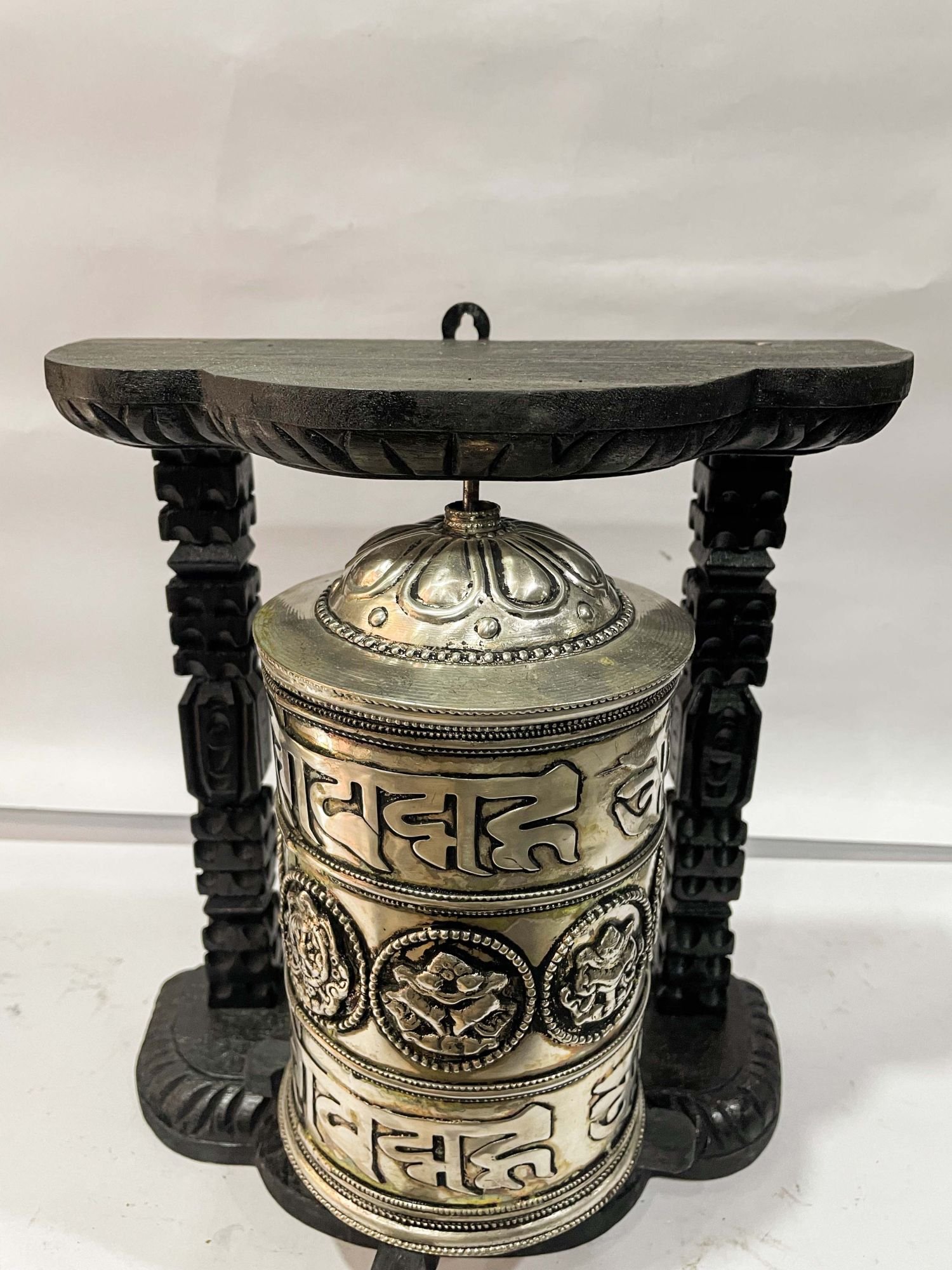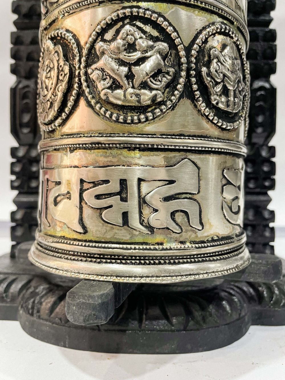 A prayer wheel is a cylindrical wheel on a spindle made from metal, wood, stone, leather, or coarse cotton. Traditionally, the mantra Om Mani Padme Hum is written in the Newari language of Nepal, on the outside of the wheel. Also sometimes depicted are Dakinis, Protectors, and very often the 8 auspicious symbols Ashtamangala. At the core of the cylinder is a "Life Tree" often made of wood or metal with certain mantras written on or wrapped around it. Many thousands (or in the case of larger prayer wheels, millions) of mantras are then wrapped around this life tree. The Mantra Om Mani Padme Hum is most commonly used, but other mantras may be used as well. According to the Tibetan Buddhist tradition based on the lineage texts regarding prayer wheels, spinning such a wheel will have much the same meritorious effect as orally reciting the prayers. Read More