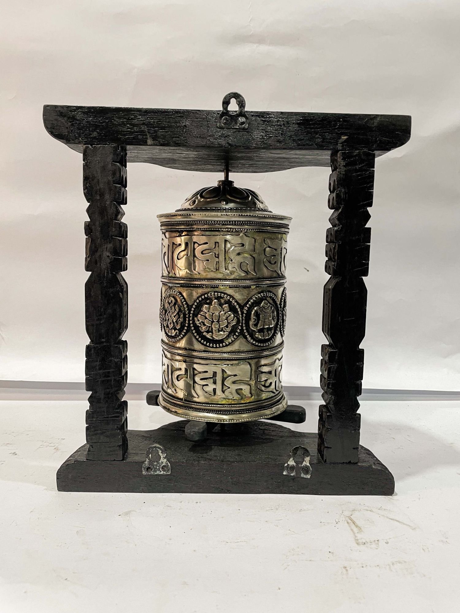 Wall Prayer Wheel with Mantra Inside, with Carved Mantra, Ashtamangala , A wheel containing mantras, used to accumulate merit and spread blessings