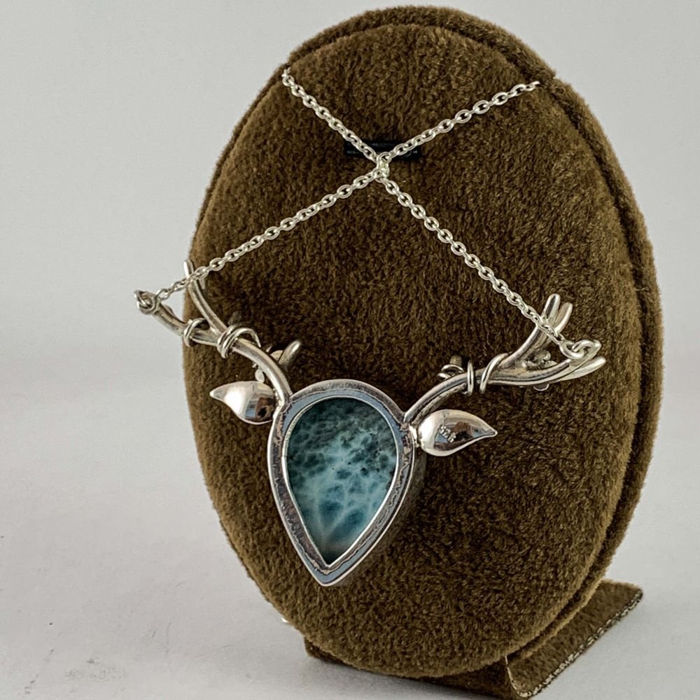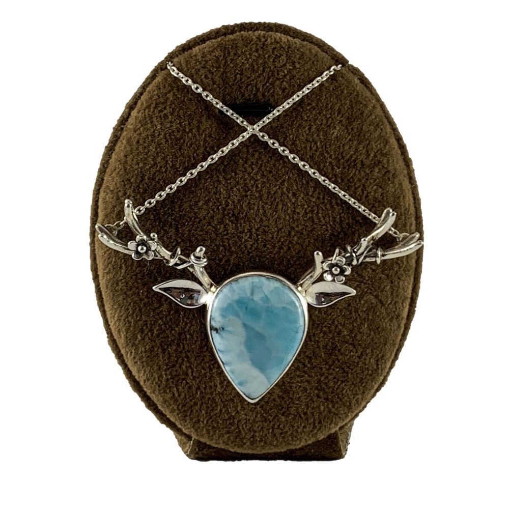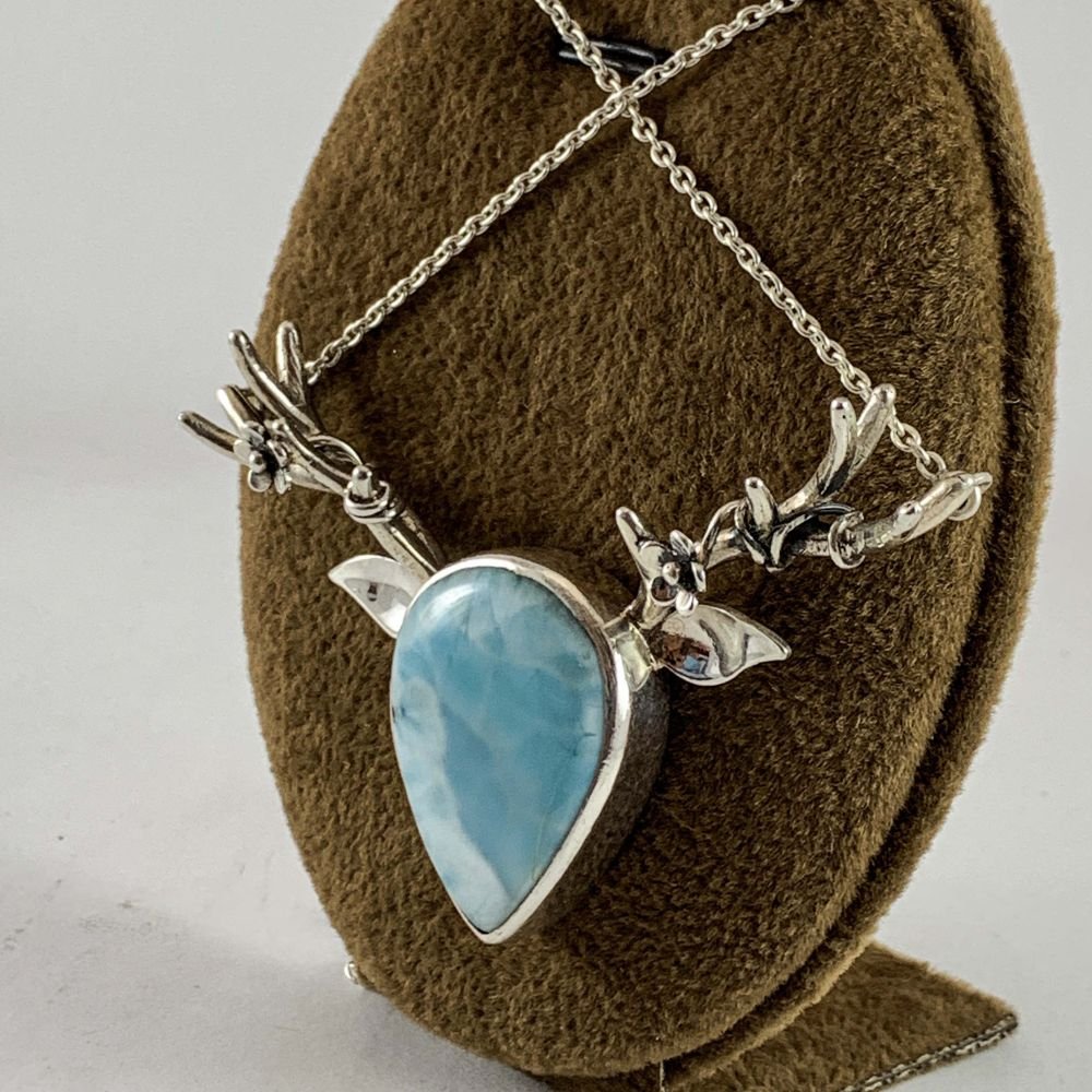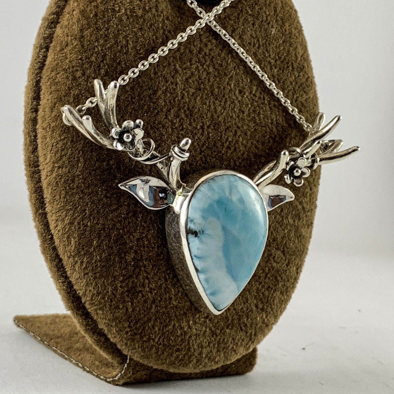 Designer Silver Larimar Deer Head with Antler Necklace |