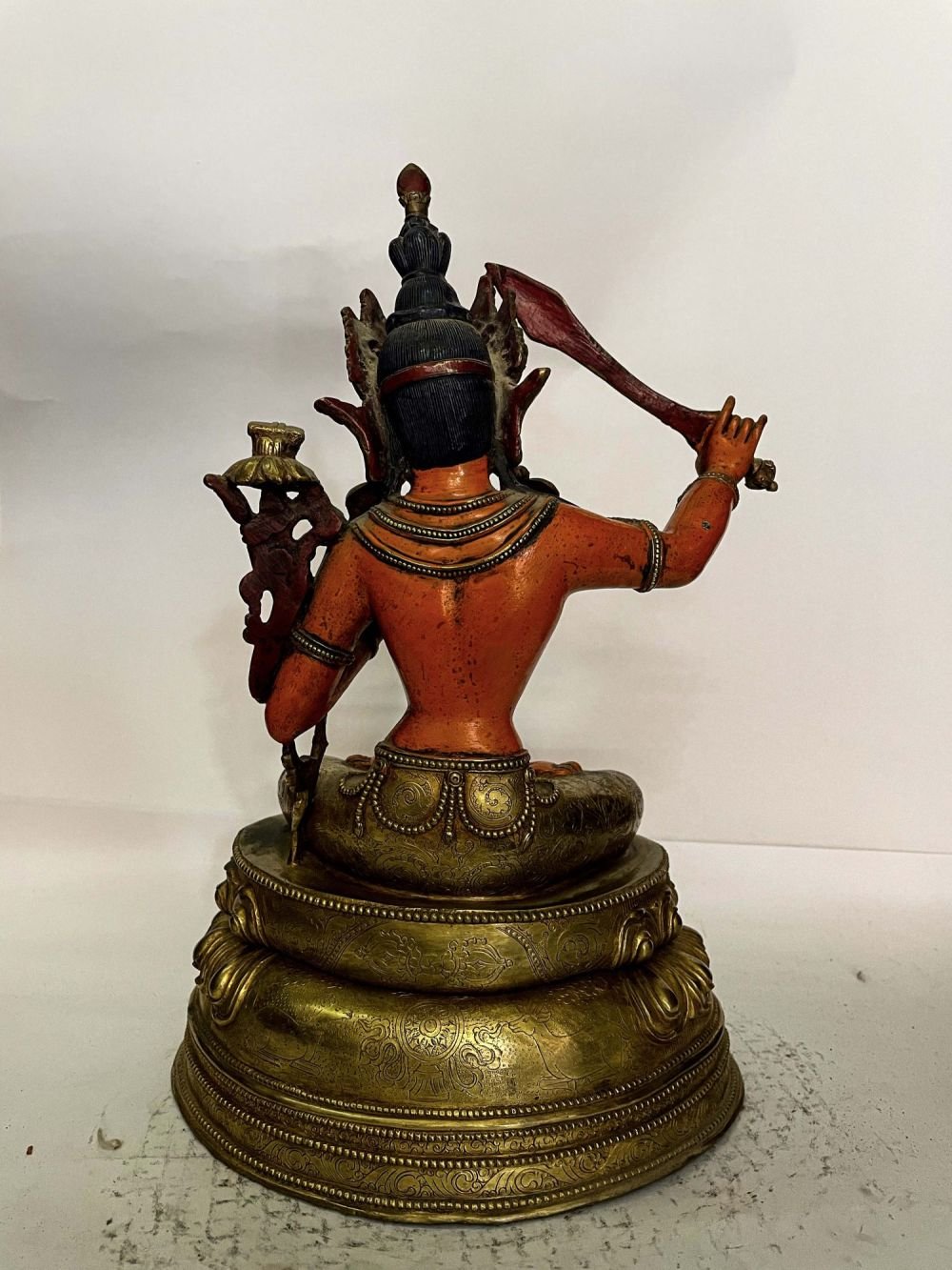 This Manjushri is finished with full gold plating. also known as mercury gold plating or fire gold plating. This traditional technique involves the application of a genuine layer of gold onto the Manjushri. Referred to as mercury gold plating, it is considered the correct and authentic form of gold plating in Nepal. Despite being more expensive than electroplating, this traditional mercury gold plating is gaining popularity again in Nepal. People are drawn to its authenticity, longevity, and the unmatched beauty it brings to the Manjushri. The resurgence of interest in this traditional form of gold plating reflects a growing appreciation for the craftsmanship and cultural heritage of Nepal Read More