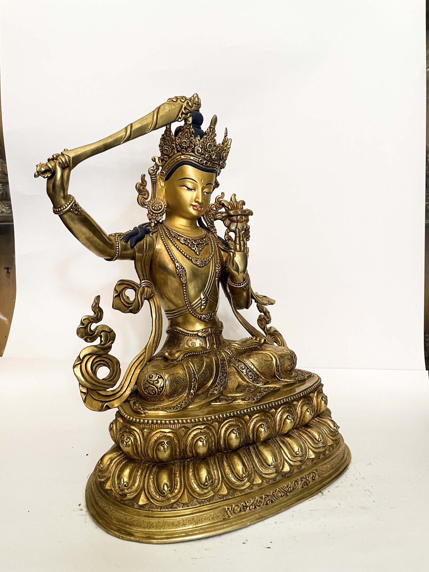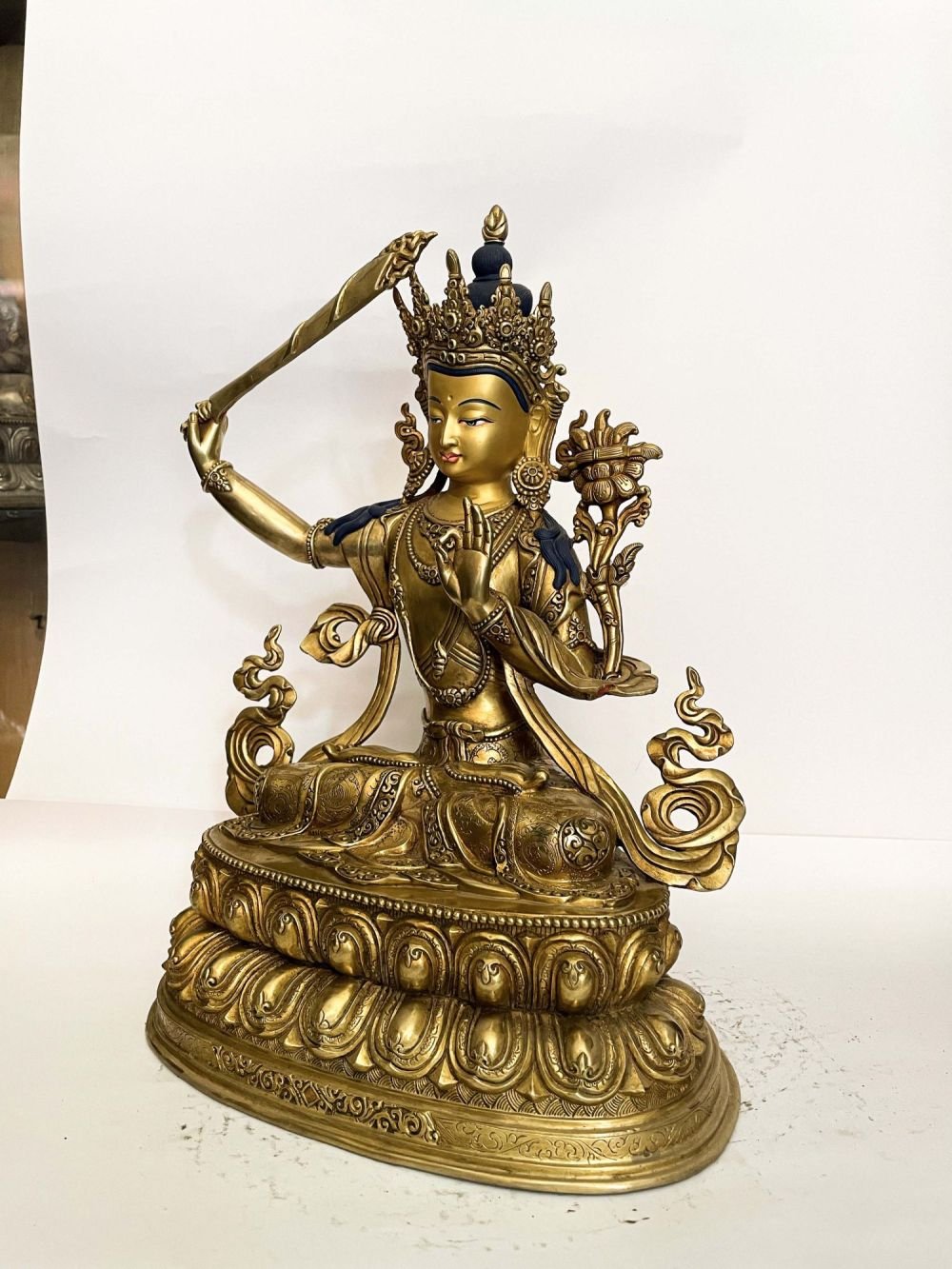 This Manjushri is finished with full gold plating. also known as mercury gold plating or fire gold plating. This traditional technique involves the application of a genuine layer of gold onto the Manjushri. Referred to as mercury gold plating, it is considered the correct and authentic form of gold plating in Nepal. Despite being more expensive than electroplating, this traditional mercury gold plating is gaining popularity again in Nepal. People are drawn to its authenticity, longevity, and the unmatched beauty it brings to the Manjushri. The resurgence of interest in this traditional form of gold plating reflects a growing appreciation for the craftsmanship and cultural heritage of Nepal Read More