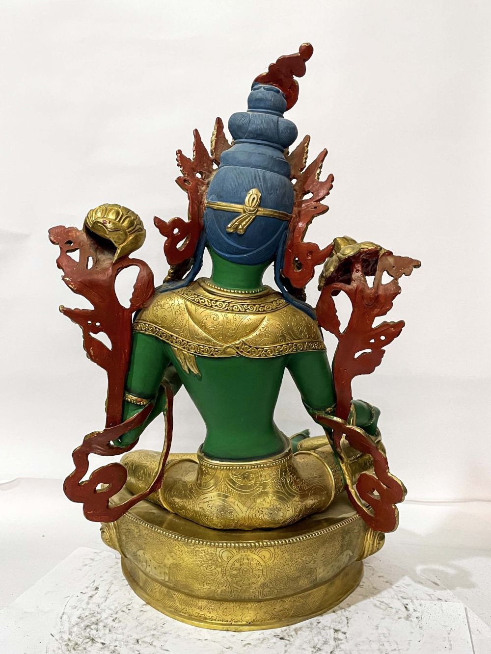 The Green Tara is adorned with traditional colors, creating a captivating aesthetic through a combination of gold and various hues. This painting technique follows a time-honored process that aims to faithfully represent the Green Tara in accordance with traditional color descriptions. In the context of Buddhist statues, this approach holds great significance. Each statue has its own primary color, and it is crucial to depict the statue in its authentic shade. Read More