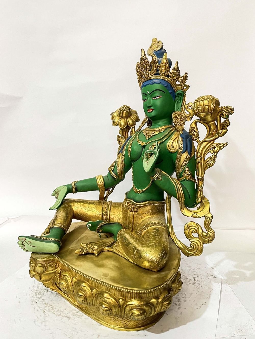 Buddhist Statue of Green Tara, Partly Gold Plated, Traditional Color , Goddess of Compassion, Protection, and Swift Action