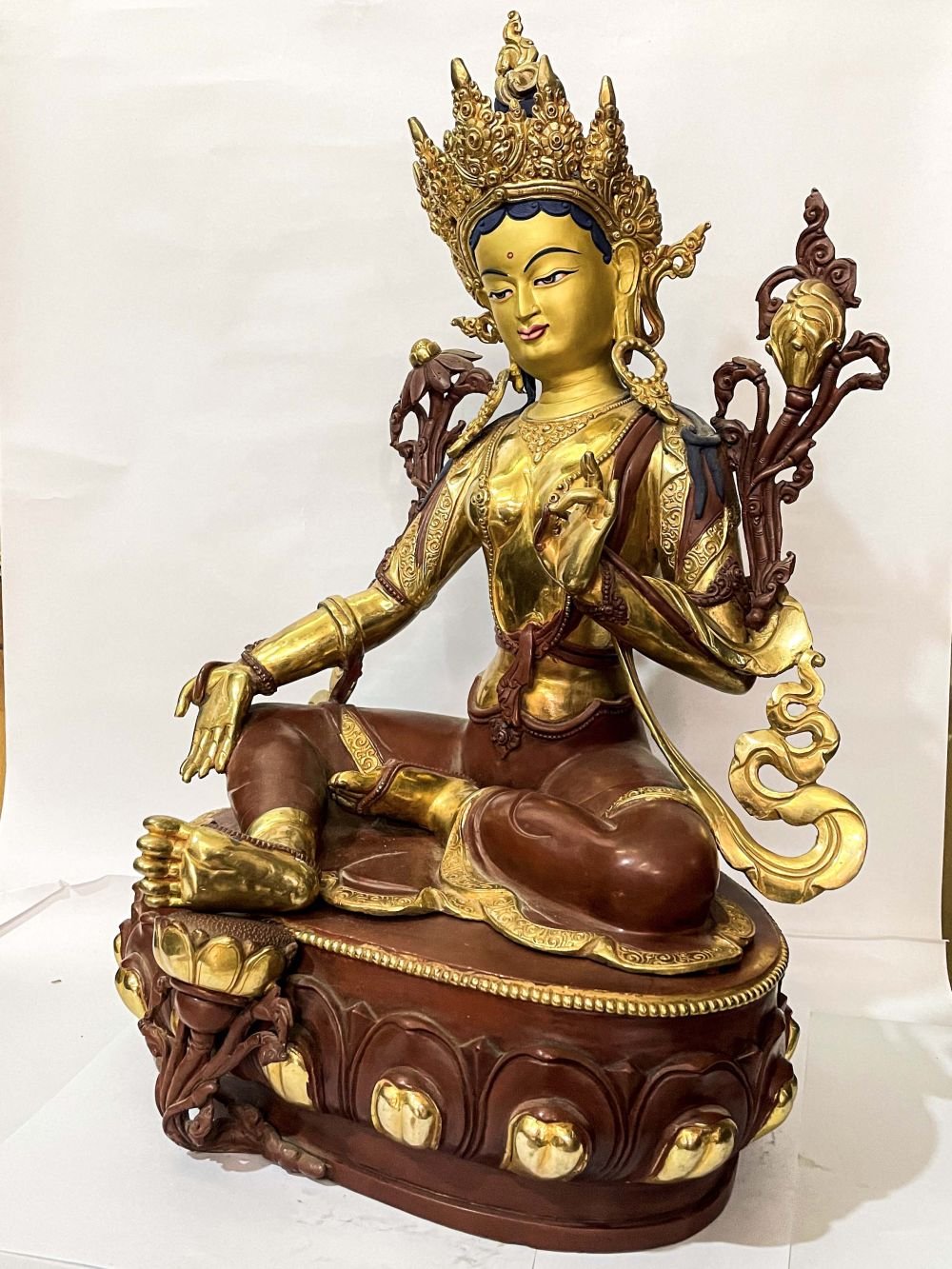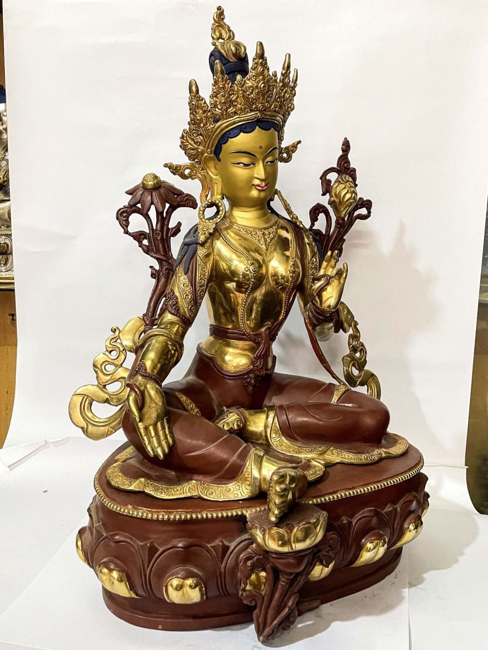 The face of Green Tara is painted with gold to enhance its significant features, particularly the eyes, and lips. This detailed painting is essential as it brings forth the crucial attributes of the expression of eyes and lips that metal carving alone cannot capture.