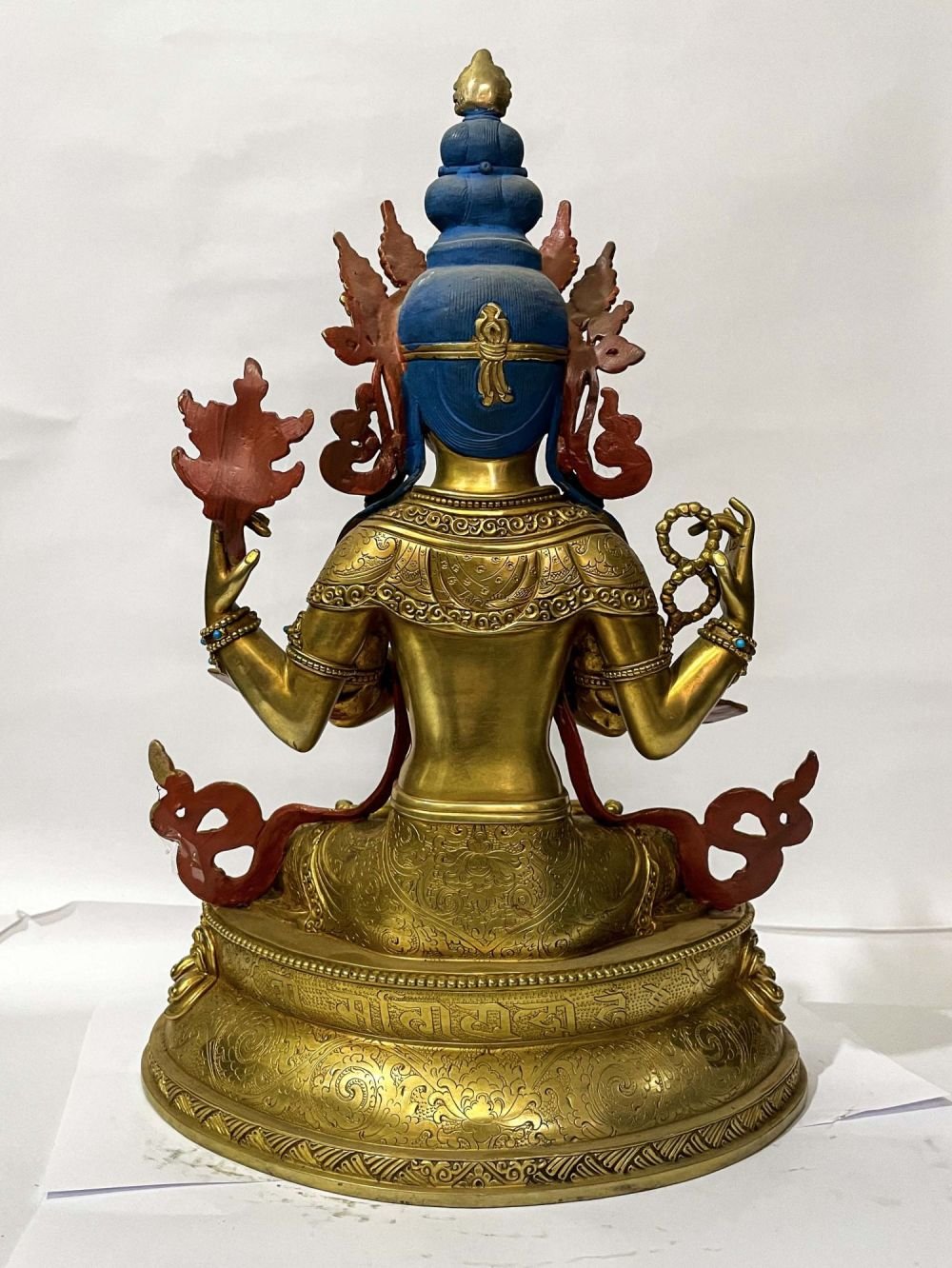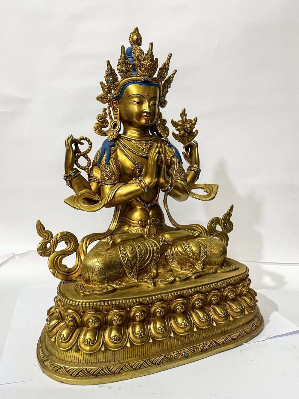 This Chenrezig is finished with full gold plating. also known as mercury gold plating or fire gold plating. This traditional technique involves the application of a genuine layer of gold onto the Chenrezig. Referred to as mercury gold plating, it is considered the correct and authentic form of gold plating in Nepal. Despite being more expensive than electroplating, this traditional mercury gold plating is gaining popularity again in Nepal. People are drawn to its authenticity, longevity, and the unmatched beauty it brings to the Chenrezig. The resurgence of interest in this traditional form of gold plating reflects a growing appreciation for the craftsmanship and cultural heritage of Nepal Read More
