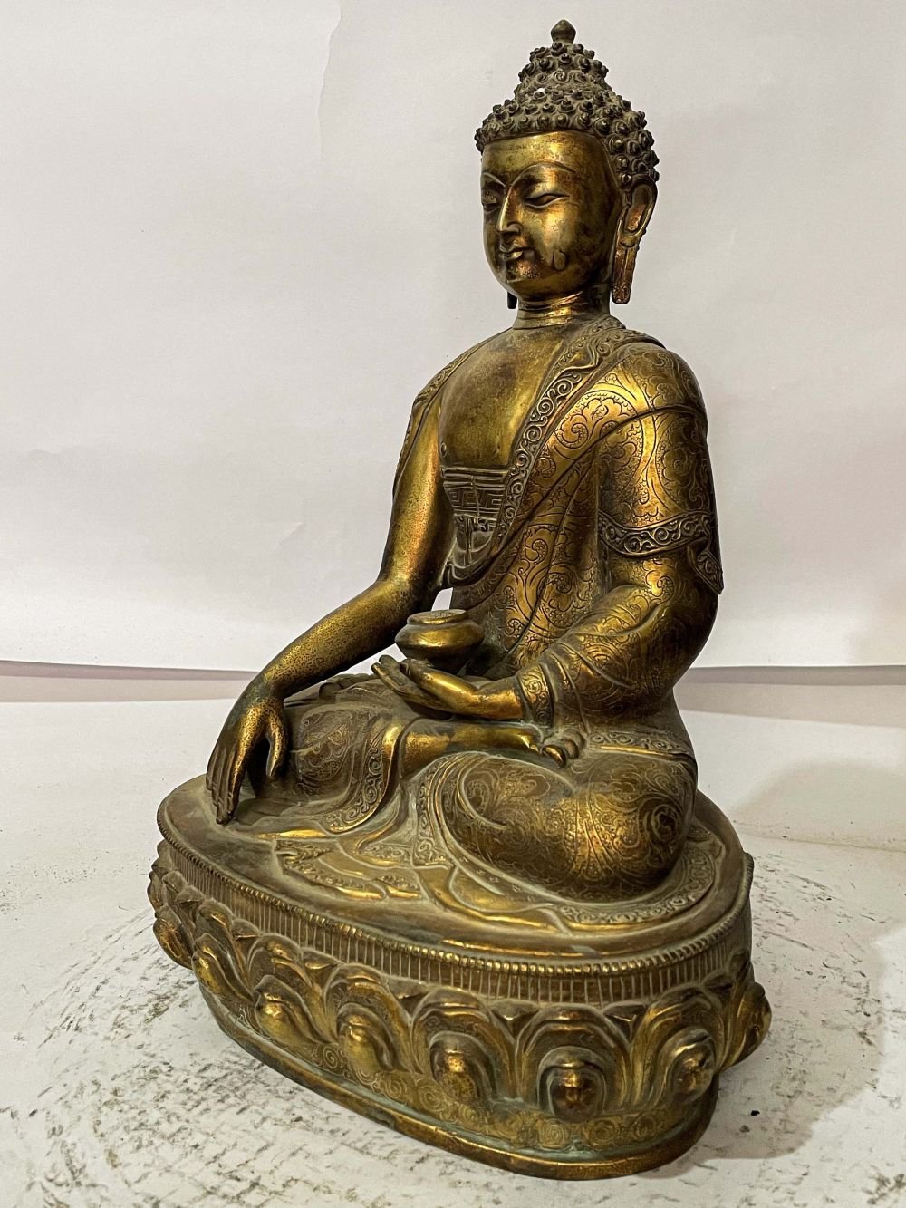 The Shakyamuni Buddha has full gold plated antique finishing. This finishing is a combination of fire mercury gold plating and antique finishing. This traditional technique involves the application of a genuine layer of gold onto the Shakyamuni Buddha using the time-honored process of mercury gold plating. Skilled artisans meticulously handle the amalgamation of gold with mercury, ensuring precise application and a truly authentic result. To enhance its charm further, the Shakyamuni Buddha undergoes an antique finishing process. This meticulous treatment adds a touch of age and character to the gold plating, creating a sense of antiquity. Through careful craftsmanship and the application of specialized techniques, the Shakyamuni Buddha acquires a beautifully aged appearance that adds depth and uniqueness to its overall aesthetic. Read More