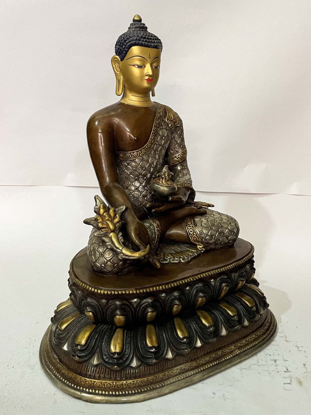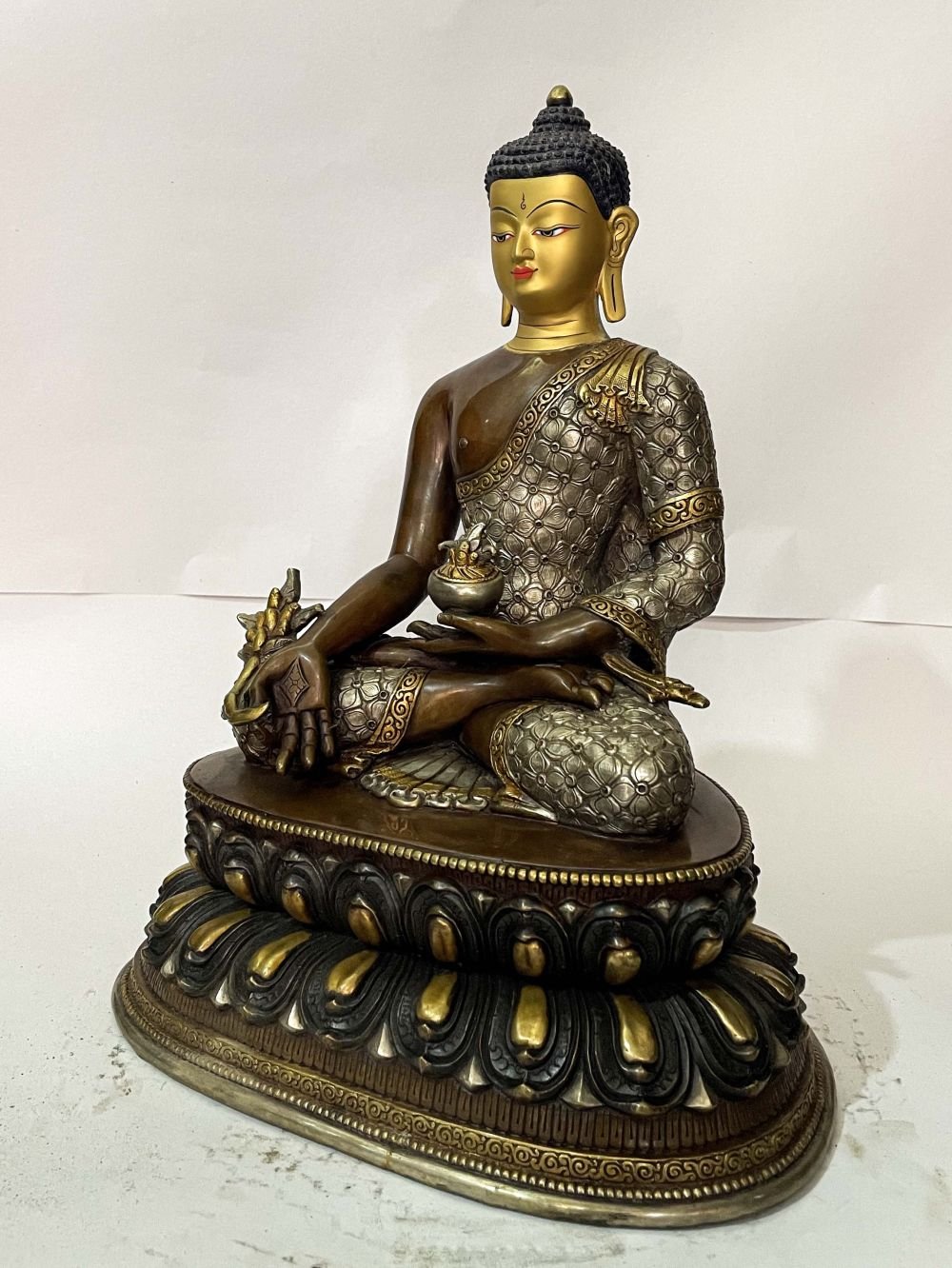 Master Quality, Buddhist Statue of Medicine Buddha, Chocolate Oxidized, with Silver and Gold, Face Painted , Healer of physical and spiritual ailments, bringer of health and peace