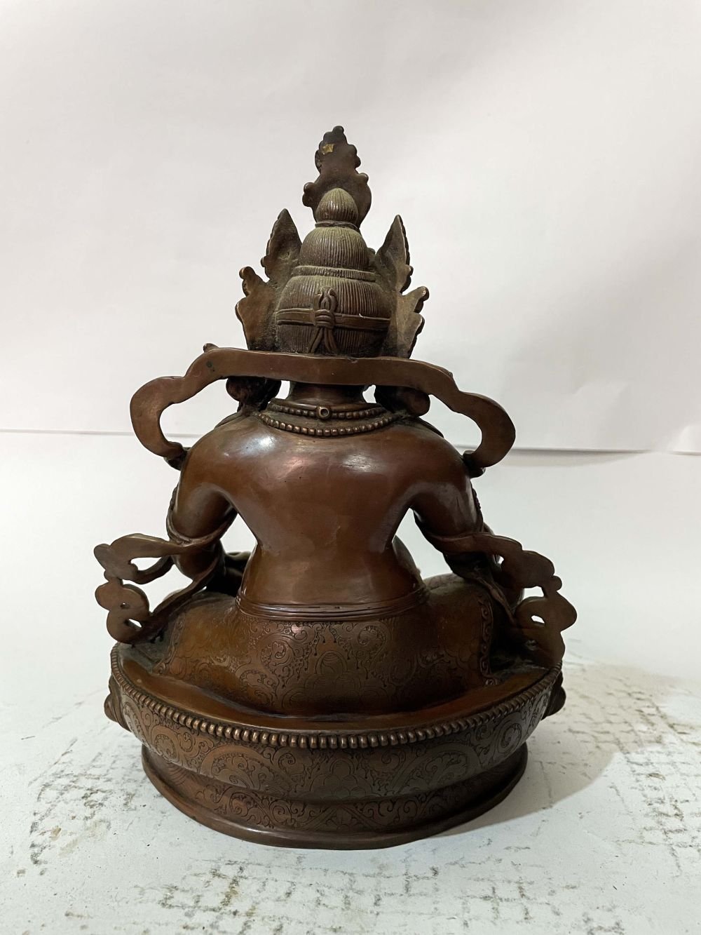 This Yellow Jambhala has been meticulously treated with a chocolate color antique patina. The intention behind this patina is to replicate the appearance of a copper statue that has gracefully aged over a century. Unlike a simple coat of paint, this patina is not applied superficially and is designed to endure. It undergoes an artificial oxidation process that adds depth and character, while also serving as a protective layer against natural oxidation.
