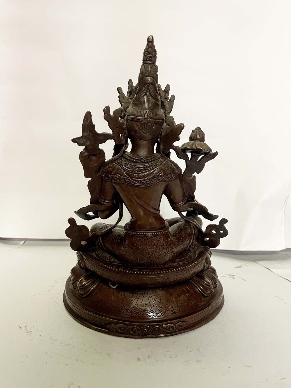 This Green Tara has been meticulously treated with a chocolate color antique patina. The intention behind this patina is to replicate the appearance of a copper statue that has gracefully aged over a century. Unlike a simple coat of paint, this patina is not applied superficially and is designed to endure. It undergoes an artificial oxidation process that adds depth and character, while also serving as a protective layer against natural oxidation.
