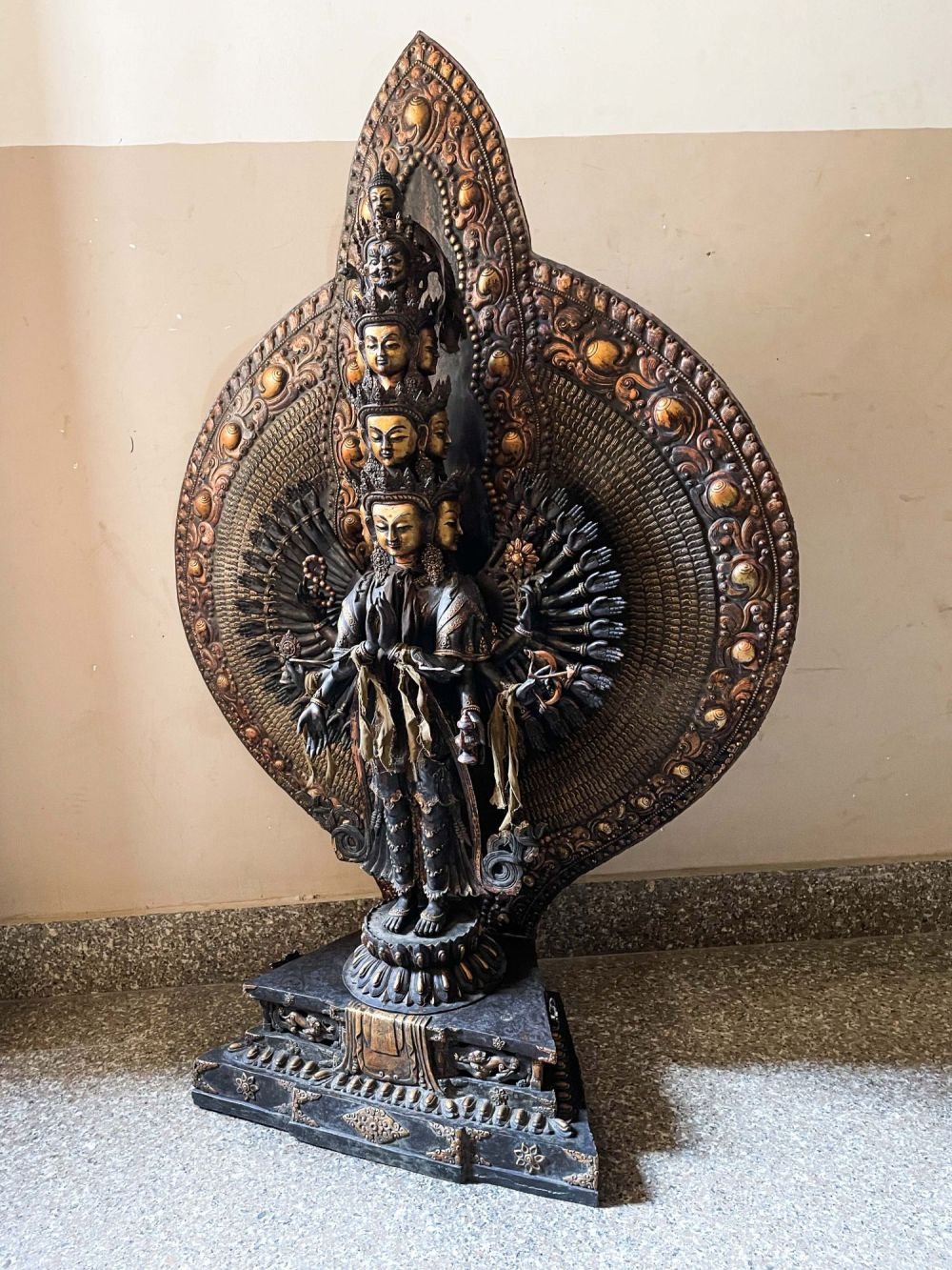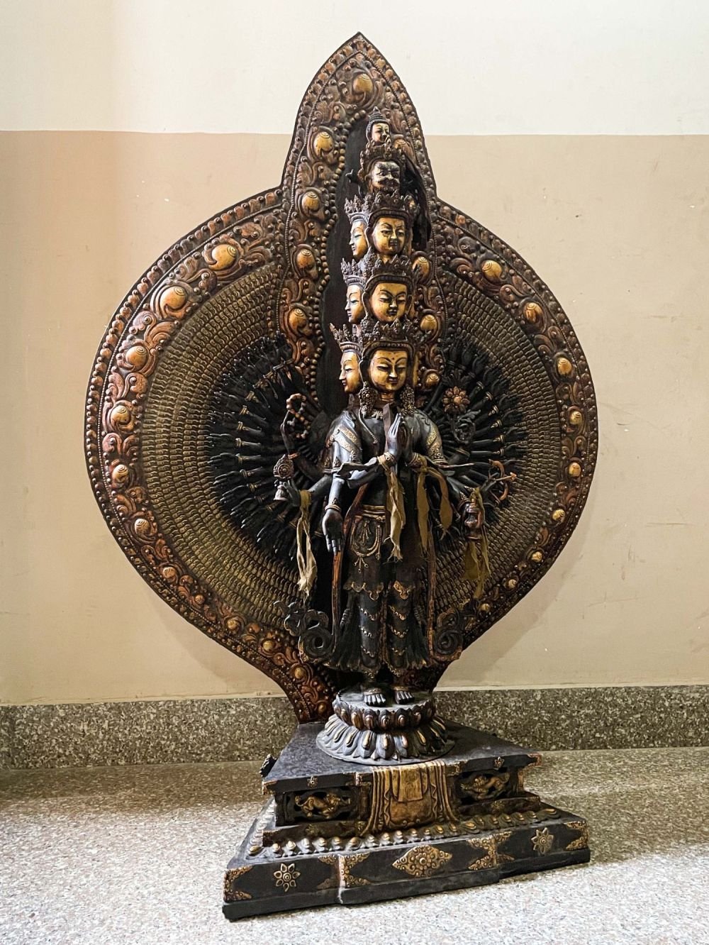 According to legend, Avalokiteshvara vowed never to rest until he had liberated all beings from suffering. Seeing the endless pain in the world, his body shattered into pieces. Amitabha Buddha, his spiritual father, reassembled him in this form with a thousand arms and eleven heads, enabling him to better serve all beings.