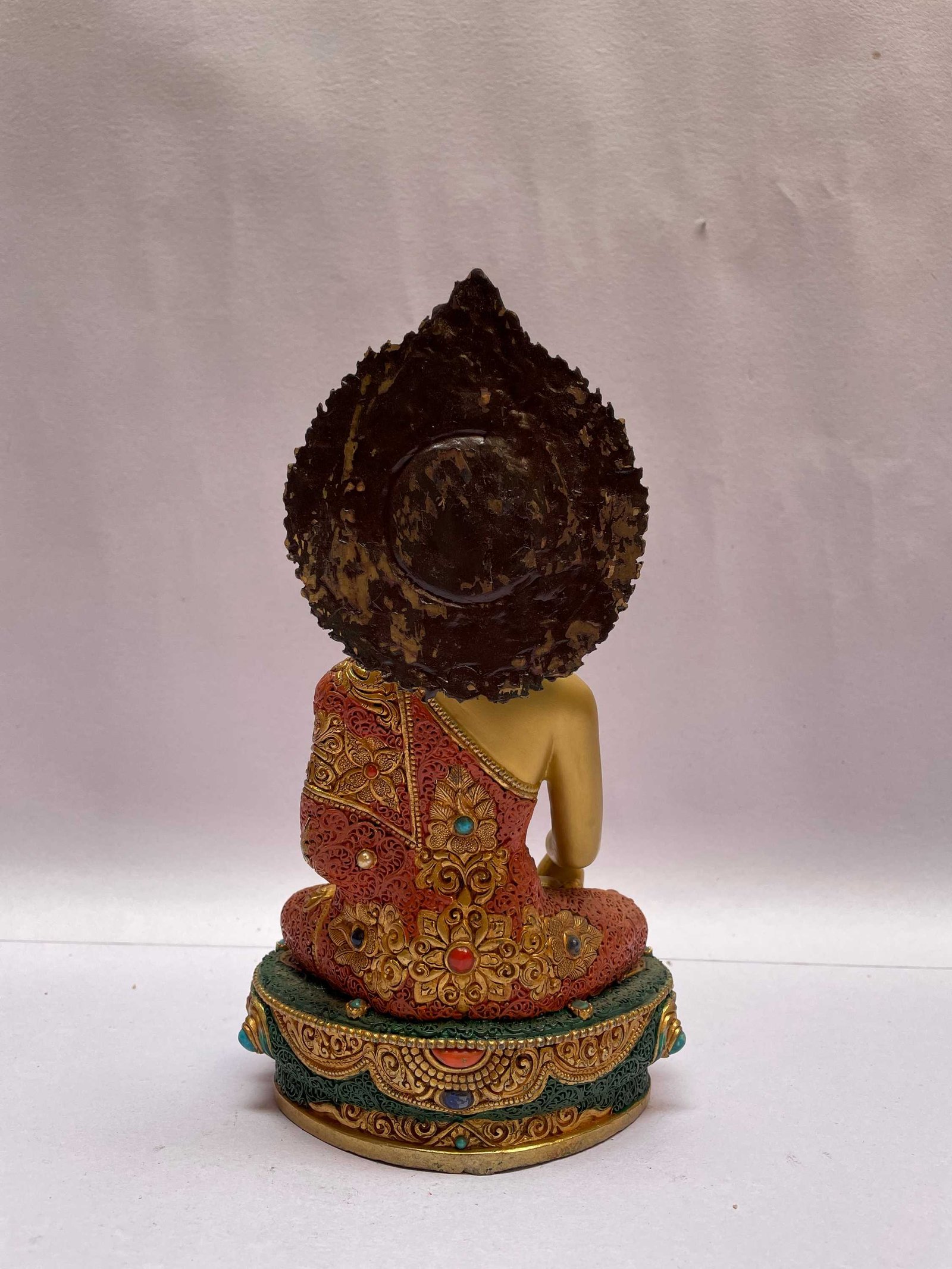 The Shakyamuni Buddha is adorned with an exquisite array of semi-precious stones, including turquoise, coral, and lapis lazuli. These stones are carefully selected and meticulously placed on the Shakyamuni Buddha's surface, adding a touch of opulence and enhancing its overall beauty. Each stone is thoughtfully positioned using a high-quality adhesive, ensuring secure and long-lasting attachment. The vibrant colors and unique patterns of the stones create a captivating contrast against the backdrop of the Shakyamuni Buddha, elevating its visual appeal and making it truly eye-catching. Read More