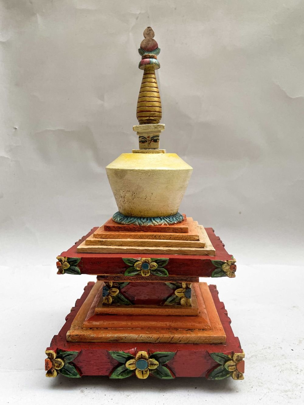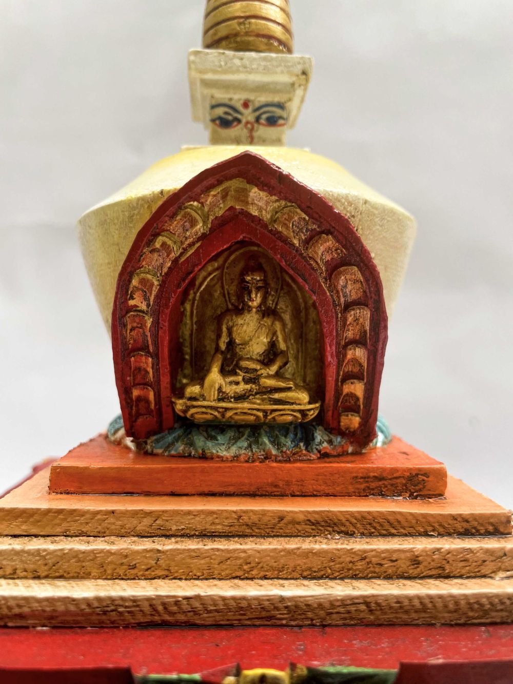 Buddhist Wooden Statue of Stupa, with Shakyamuni Buddha, Traditional Color Finishing , Sacred monument, representing the enlightened mind of the Buddha