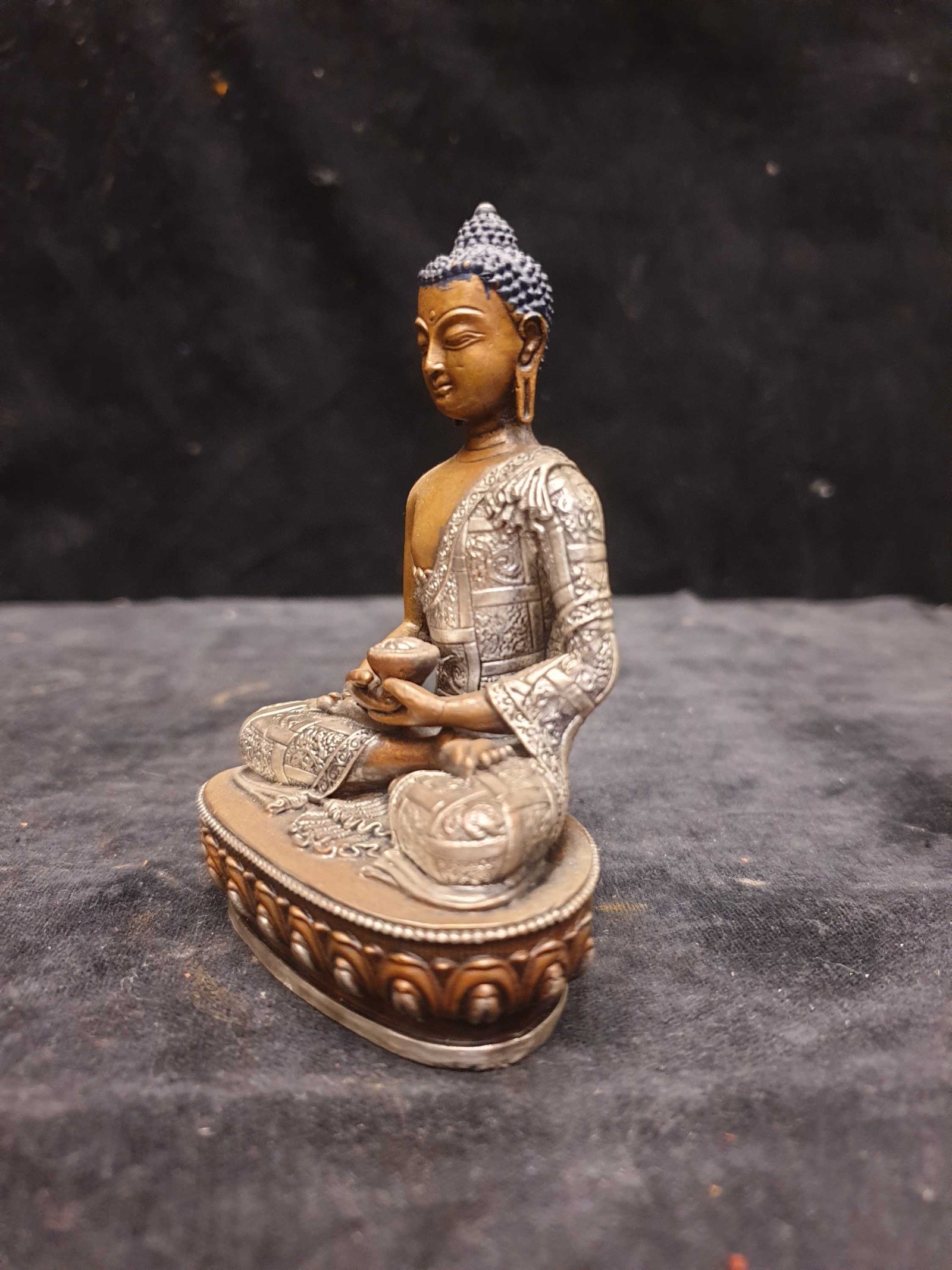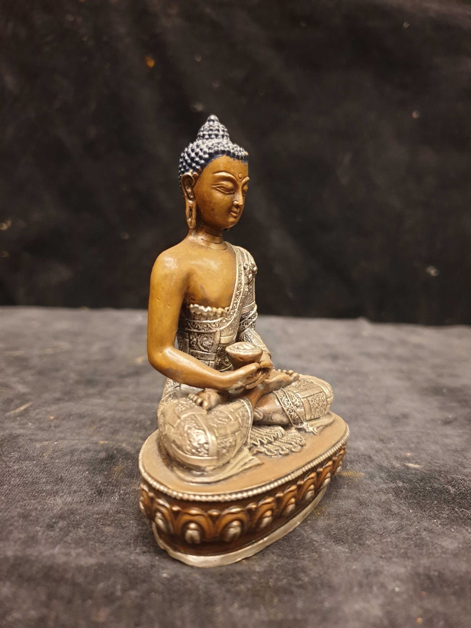 The Amitabha Buddha features a captivating combination of partly silver plating and dark oxidation. This unique finishing technique combines the lustrous shine of silver with the rich, deep tones achieved through oxidation. In the process of creating this finish, selected areas of the Amitabha Buddha are expertly silver-plated, creating a radiant and reflective surface that catches the light. The remaining areas are intentionally oxidized, resulting in a darkened patina that adds depth and character to the piece. Read More