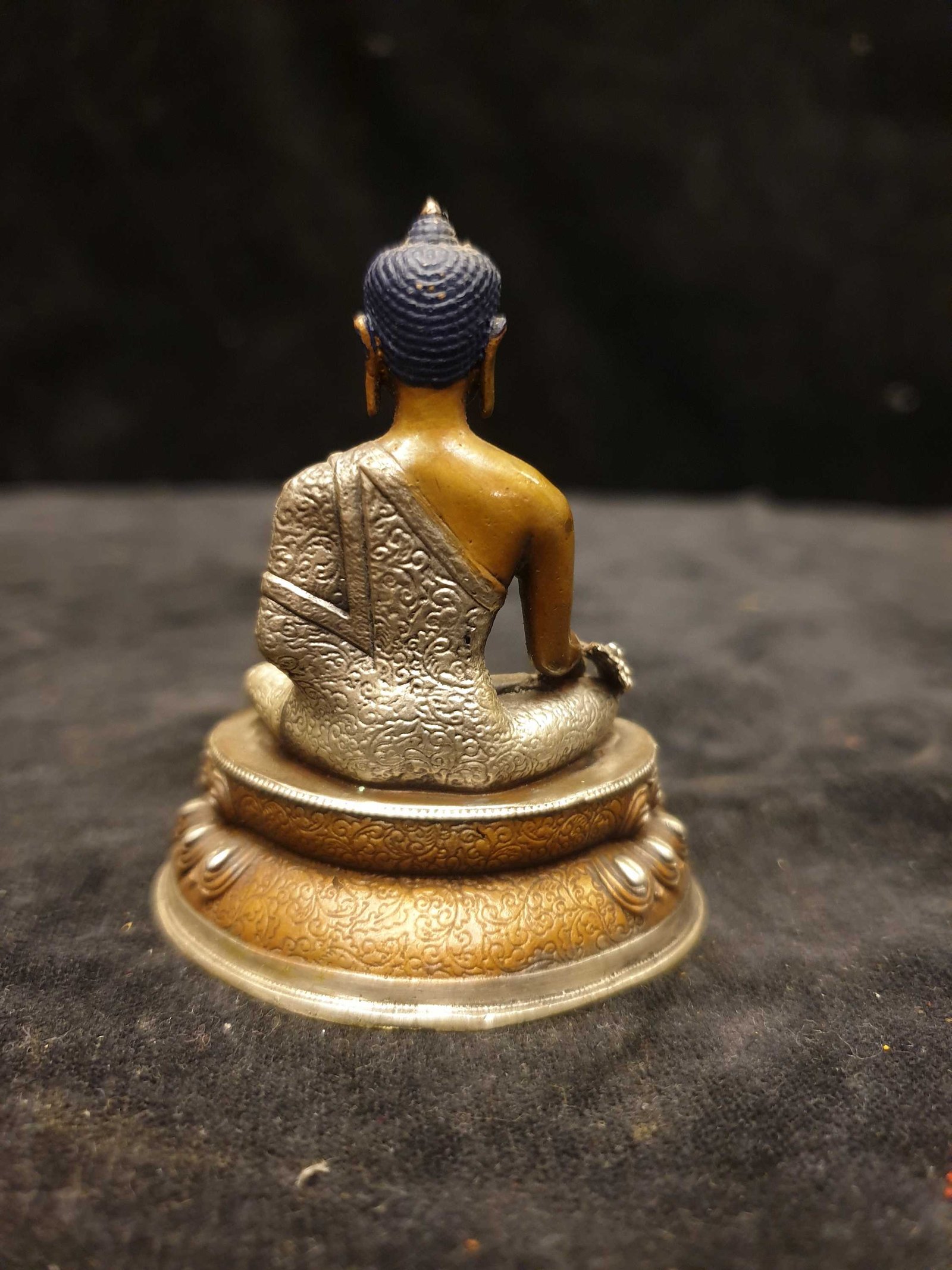 The Medicine Buddha features a captivating combination of partly silver plating and dark oxidation. This unique finishing technique combines the lustrous shine of silver with the rich, deep tones achieved through oxidation. In the process of creating this finish, selected areas of the Medicine Buddha are expertly silver-plated, creating a radiant and reflective surface that catches the light. The remaining areas are intentionally oxidized, resulting in a darkened patina that adds depth and character to the piece. Read More