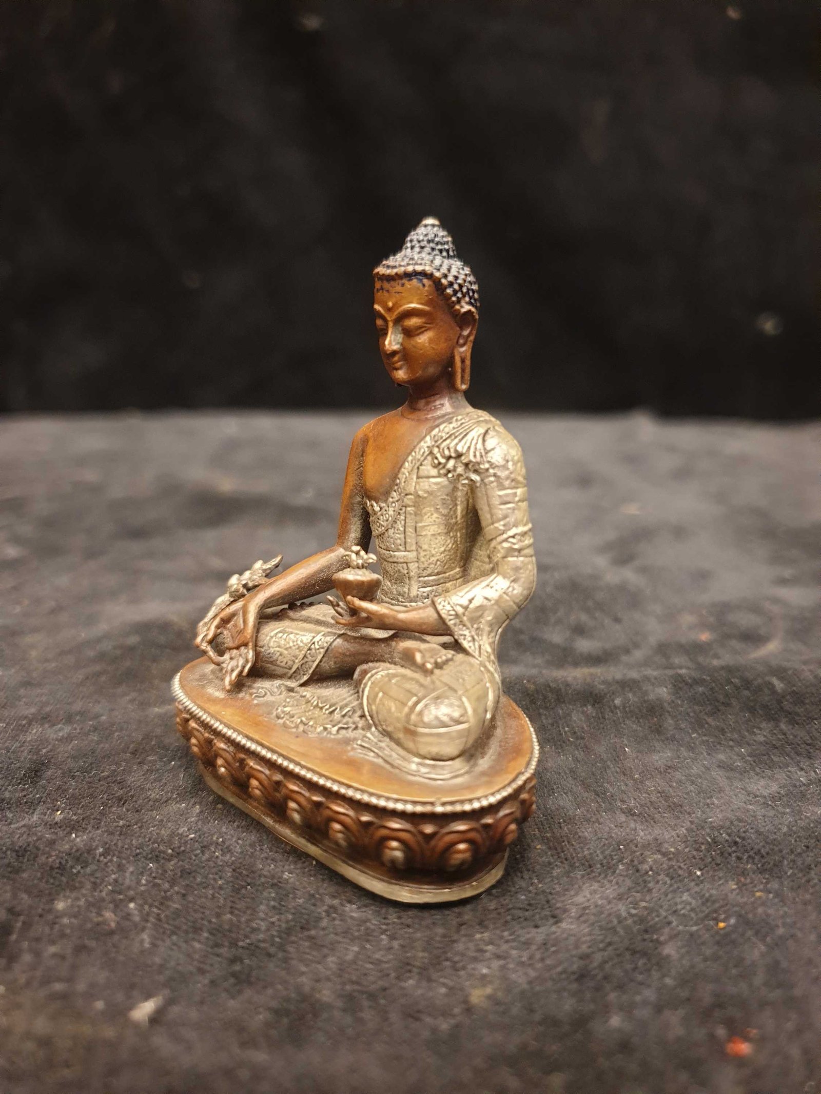 Buddhist Miniature Statue of Medicine Buddha, Silver and Chocolate Oxidized , Healer of physical and spiritual ailments, bringer of health and peace