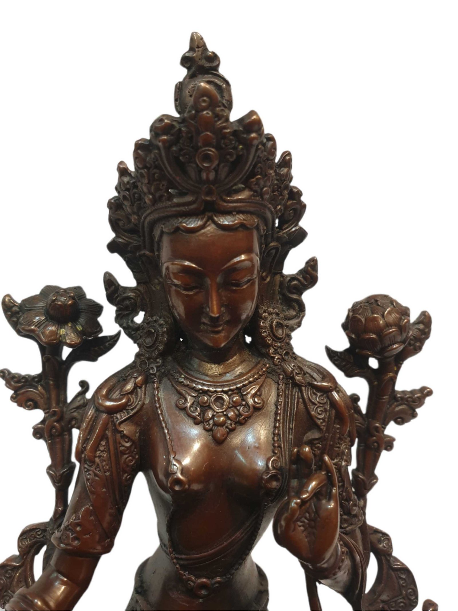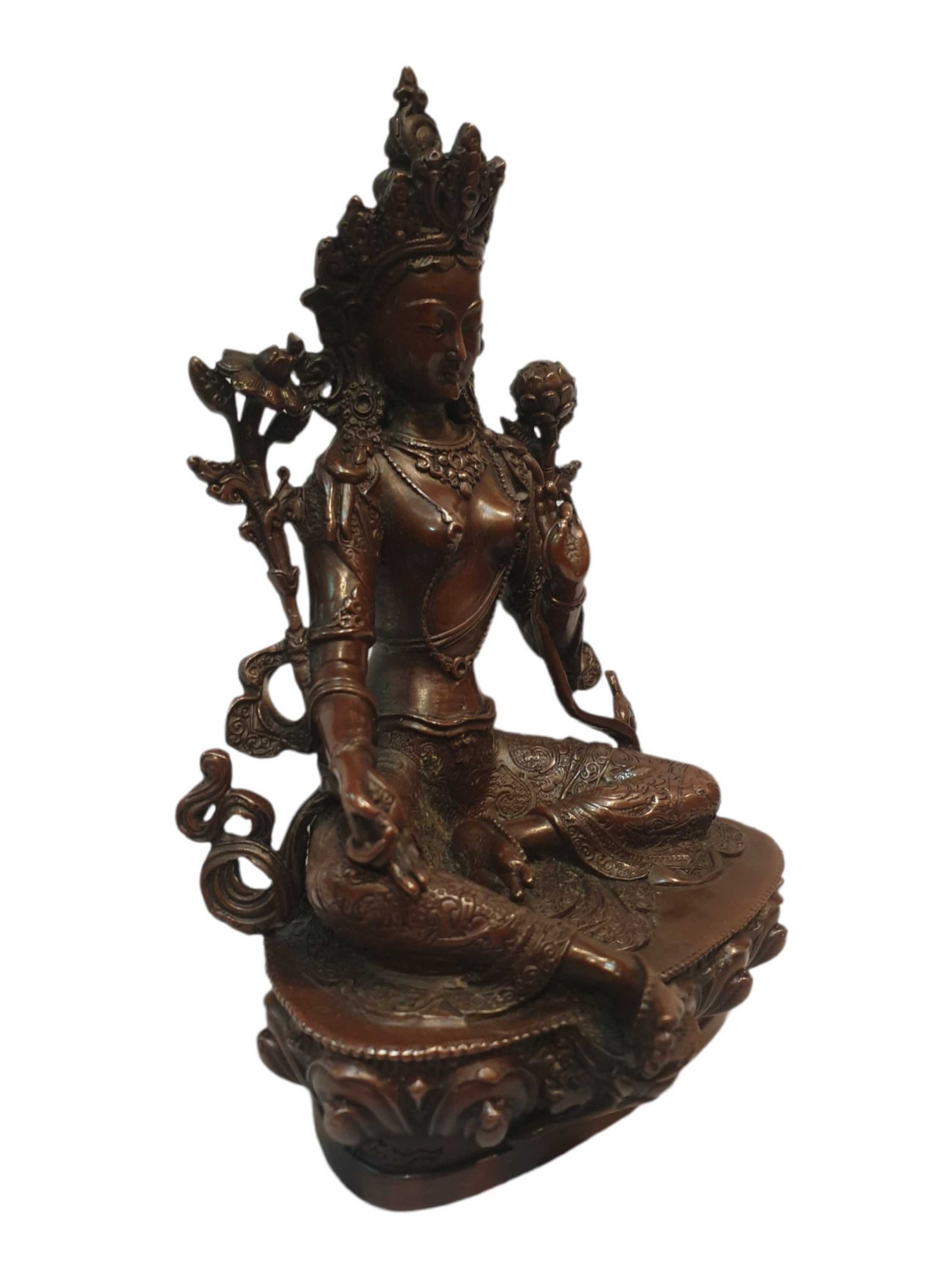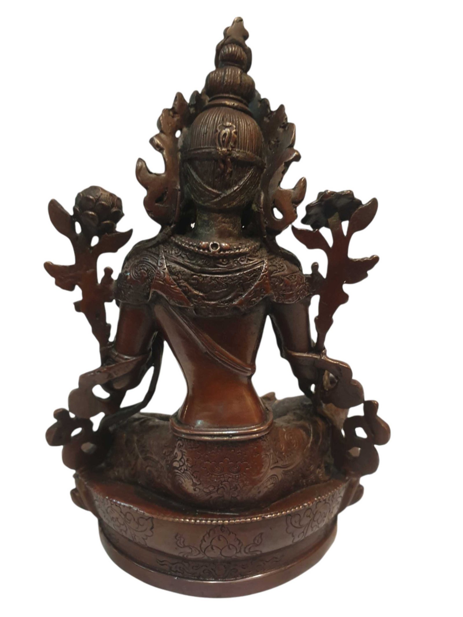 This Green Tara has been meticulously treated with a chocolate color antique patina. The intention behind this patina is to replicate the appearance of a copper statue that has gracefully aged over a century. Unlike a simple coat of paint, this patina is not applied superficially and is designed to endure. It undergoes an artificial oxidation process that adds depth and character, while also serving as a protective layer against natural oxidation.