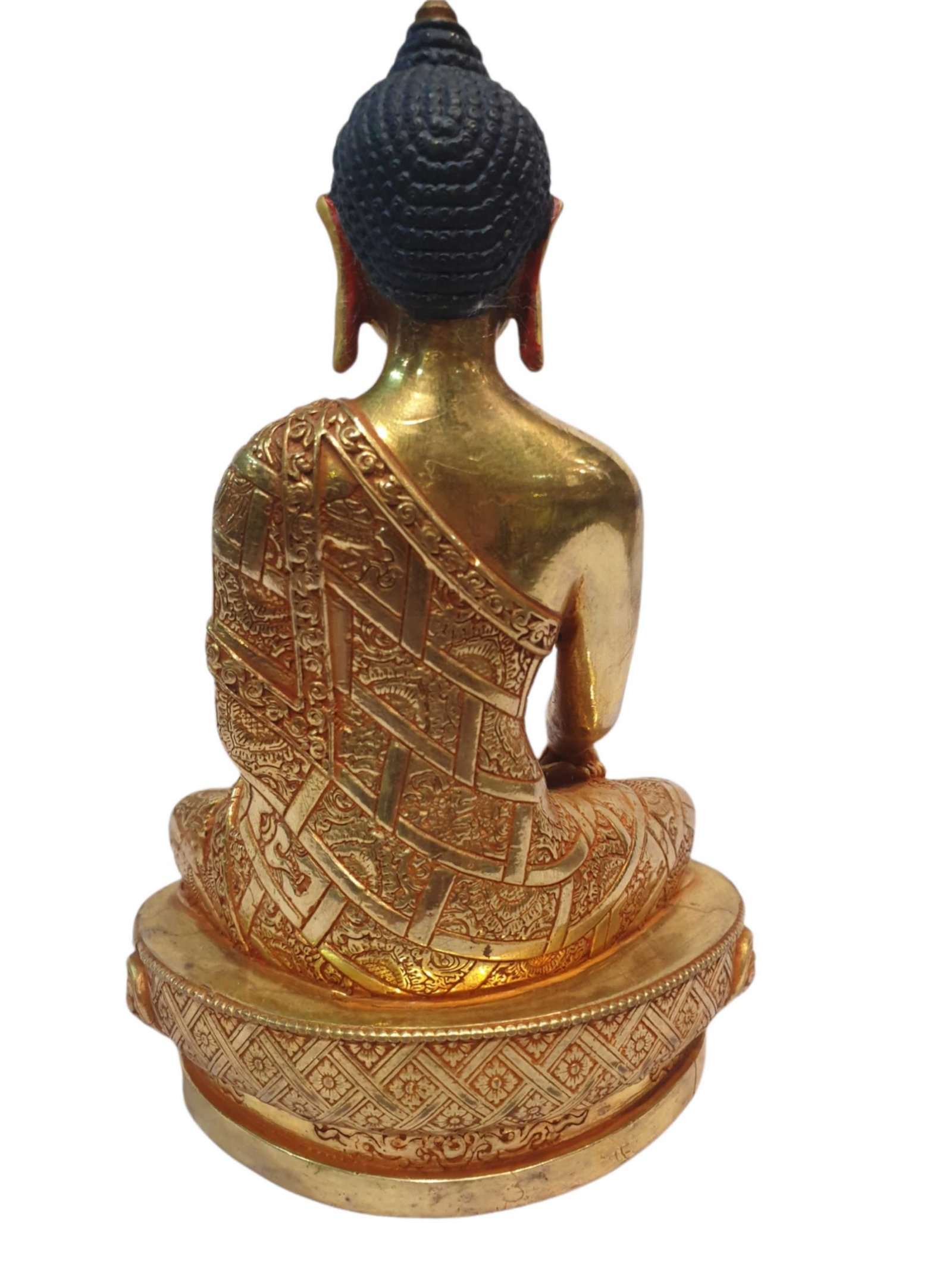 The face of Shakyamuni Buddha is painted with gold to enhance its significant features, particularly the eyes, and lips. This detailed painting is essential as it brings forth the crucial attributes of the expression of eyes and lips that metal carving alone cannot capture.