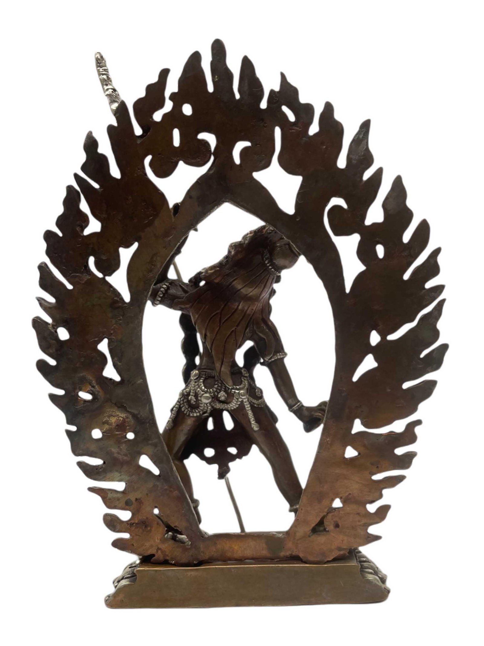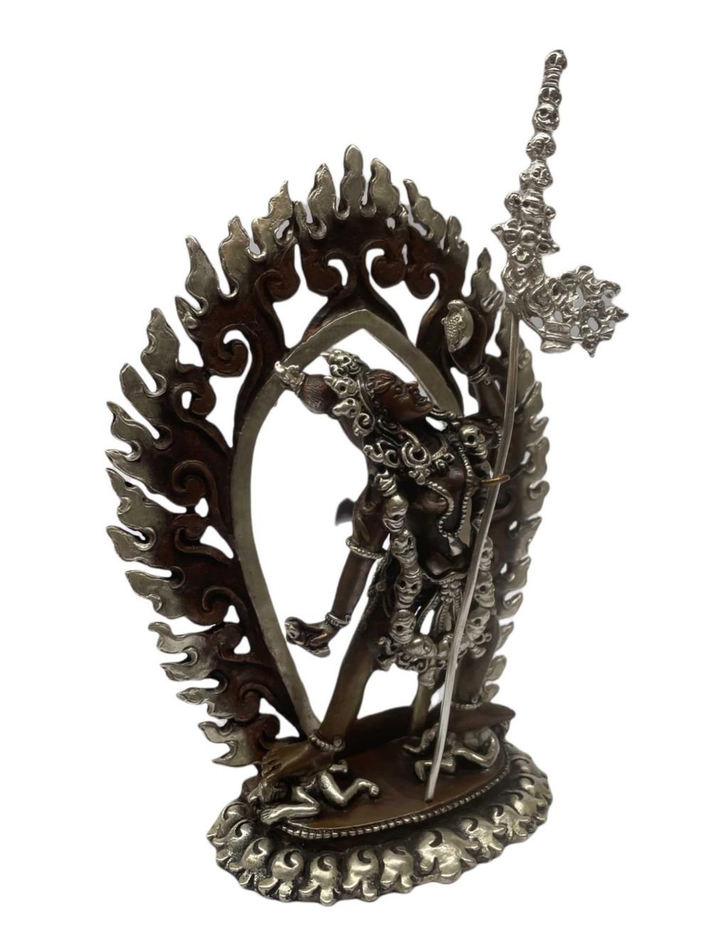The Vajrayogini features a captivating combination of partly silver plating and dark oxidation. This unique finishing technique combines the lustrous shine of silver with the rich, deep tones achieved through oxidation. In the process of creating this finish, selected areas of the Vajrayogini are expertly silver-plated, creating a radiant and reflective surface that catches the light. The remaining areas are intentionally oxidized, resulting in a darkened patina that adds depth and character to the piece. Read More