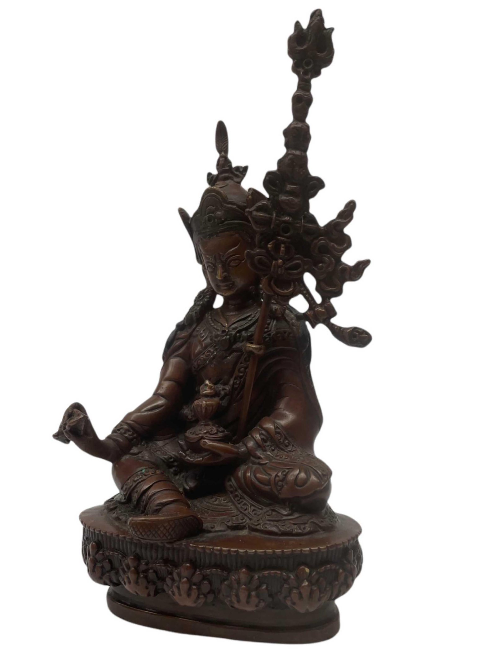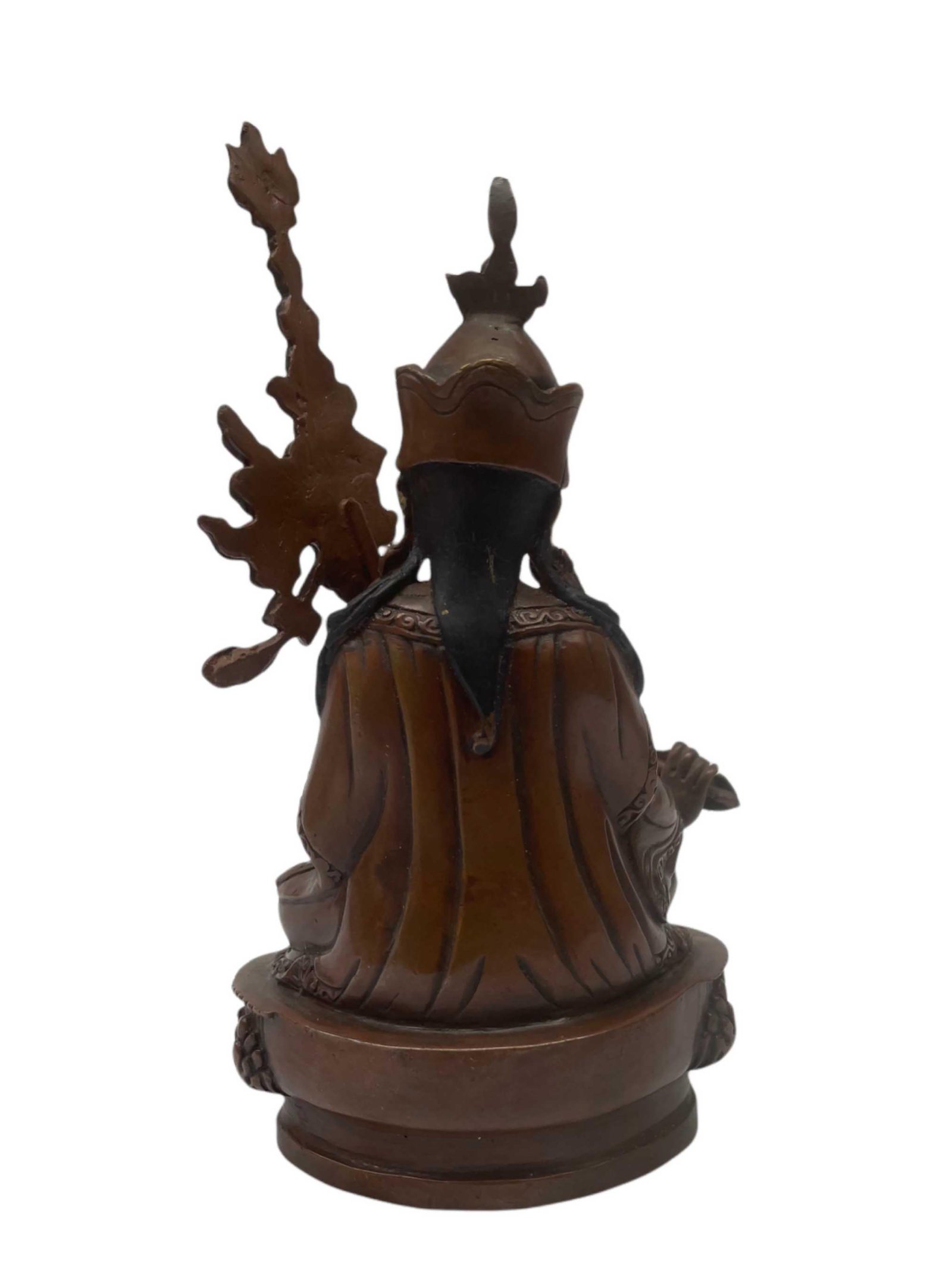 This Padmasambhava has been meticulously treated with a chocolate color antique patina. The intention behind this patina is to replicate the appearance of a copper statue that has gracefully aged over a century. Unlike a simple coat of paint, this patina is not applied superficially and is designed to endure. It undergoes an artificial oxidation process that adds depth and character, while also serving as a protective layer against natural oxidation.