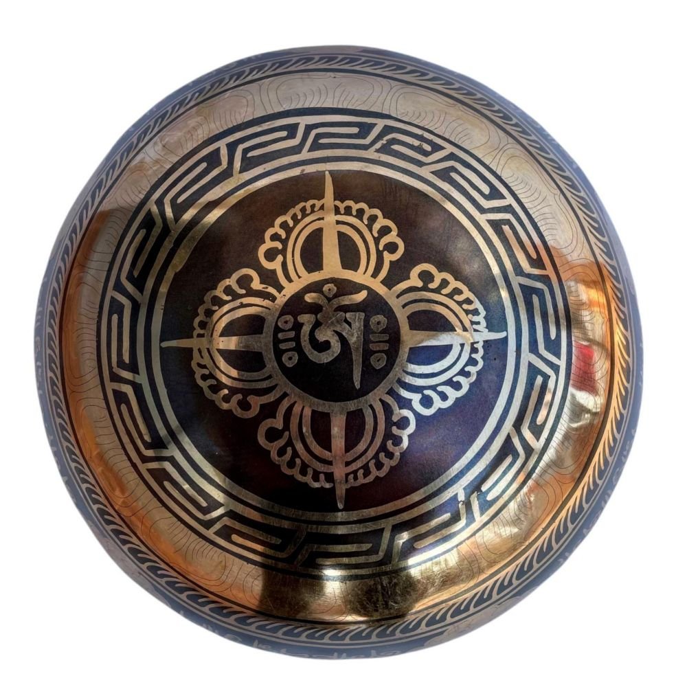 Hand Beaten Carving Singing Bowl with Double Dorje with Om, Etching, Select Accessories , A bowl used for meditation and healing, producing a soothing sound that promotes relaxation and mindfulness