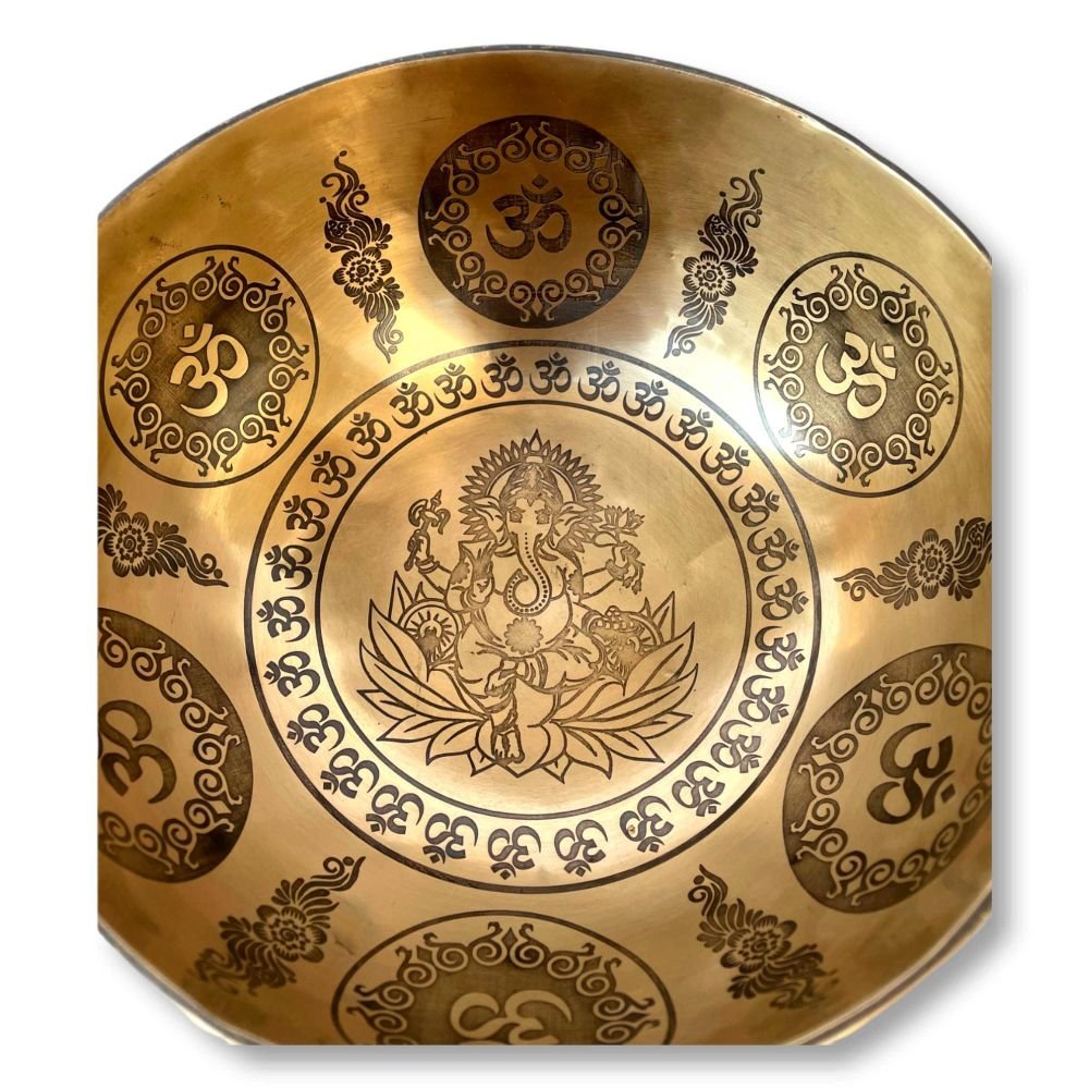 Fine Carving Singing Bowl Jambati, with Ganesh, Etching, Select Accessories , A bowl used for meditation and healing, producing a soothing sound that promotes relaxation and mindfulness