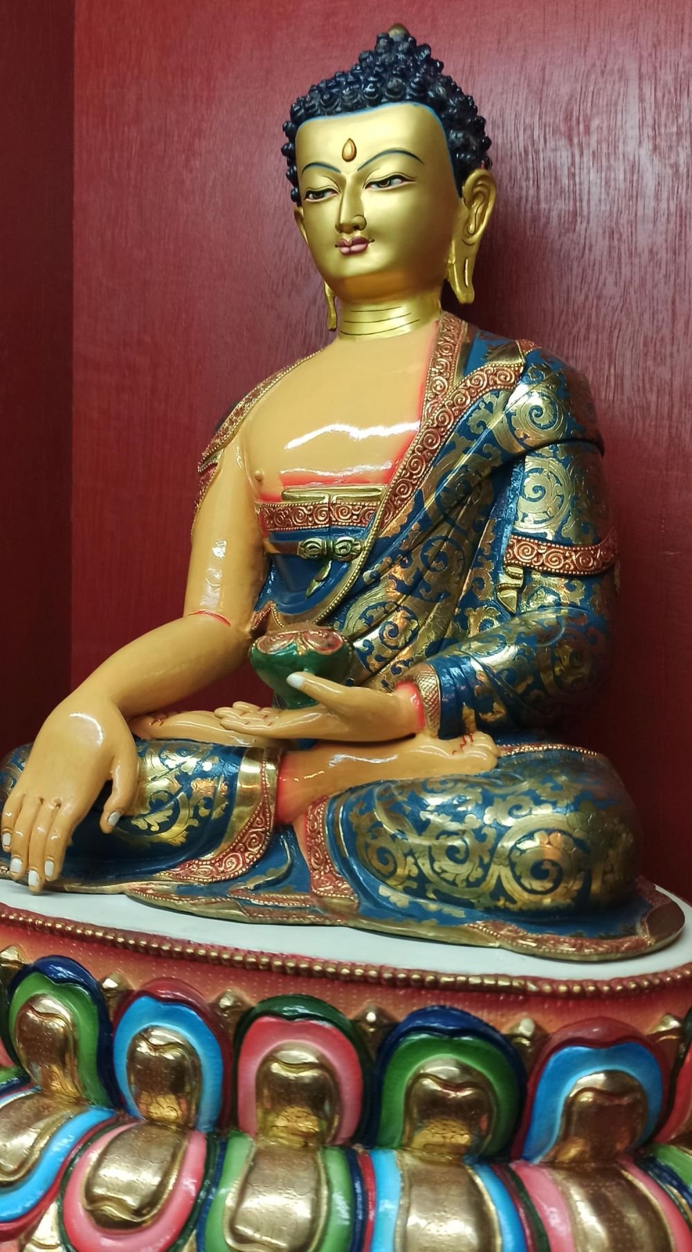Gautama is painted with golden skin sitting in a lotus seat [Skt. Padmasana] also called the meditative seat [Skt. Dhyanasana] & upon a white moon disc which represents the male principle of method which itself is upon a lotus throne. His left hand touches the ground in what is called bhumisparse mudra which symbolises his own recognition of enlightened mind in one of the most iconic images in all Buddhism. The palm always faces inwards. His feet are deliberately drawn level with one another & enlarged, being specific marks of a Buddha. His right hand supports an alms bowl [Skt. Patra], containing the liquid elixir of eternal life. Somehow the simple image of the bowl reflects his overwhelming humility & kindness. He wears the traditionally maroon gold monk's patched robe [Skt. Samghati] made of twenty five pieces of cloth which the first Buddhist monks sewed together. The Buddha has a green nimbus and blue aureole around his body signifying the highest level of understanding. Siddhartha is surrounded by Pink Lotuses [Skt. Padma]. This kind of lotus is connected with loving kindness & a flowering of pure consciousness. The closed bud to his right side represents the past or originating mind, the blooming flower represents the present & the buds represents the future Buddha Maitreya and forthcoming realisations. His elongated earlobes depict his royal connection; his knotted black hair & topknot symbolise his abandonment of worldly possessions; the dot [Skt. Urna] on his brow on the command chakra [Skt. Ajna] represents his transcendent wisdom, the 31st mark of a Buddha.